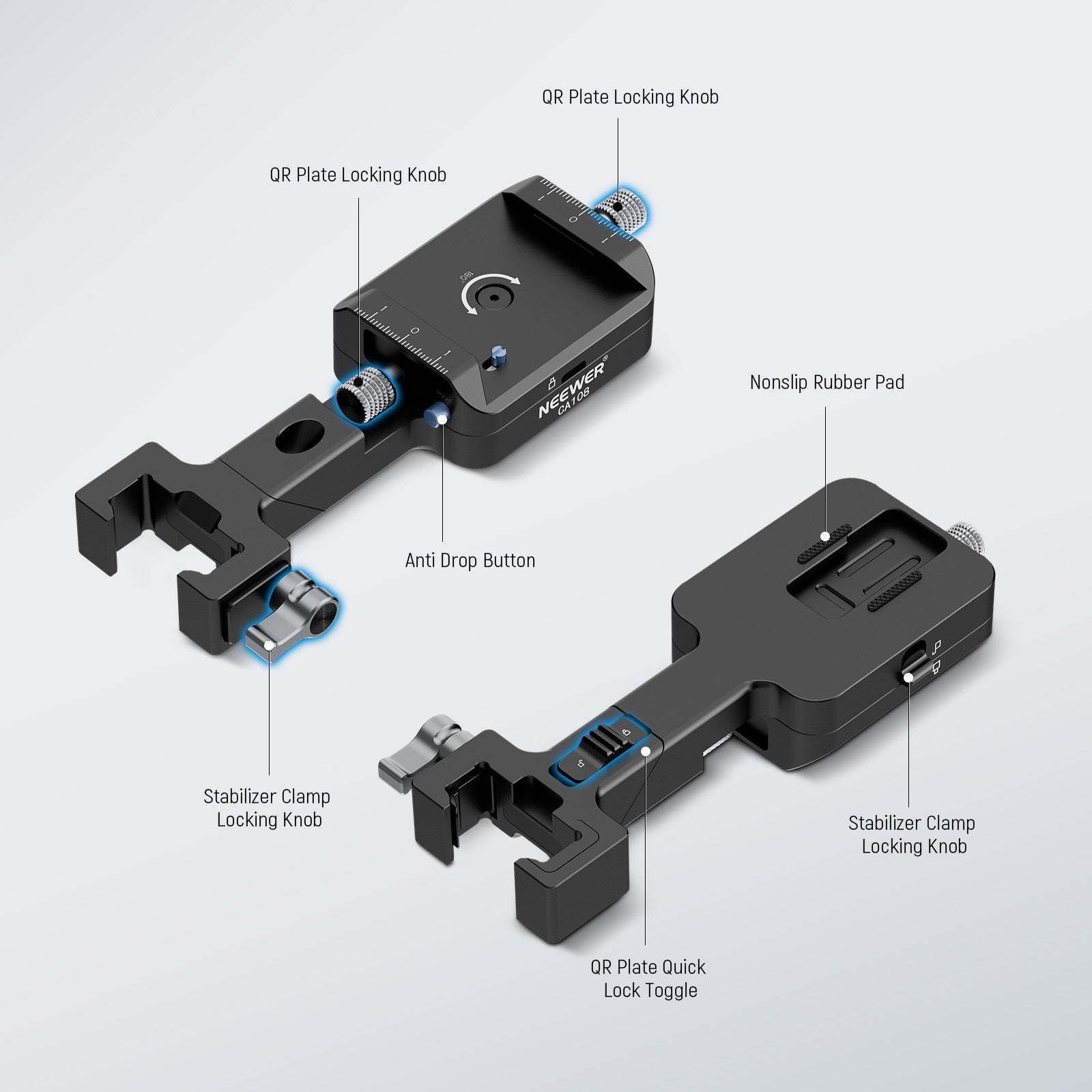 - Dual Safety Anti Drop Design- Secure your camera or other devices to the stabilizer with two tightening knobs for the quick release plate and the stabilizer clamp, and a toggle lock for the 180° rotatable QR base. The dual safety design keeps your device secure as you can only detach it by pressing the anti drop button after loosening the QR plate tightening knob