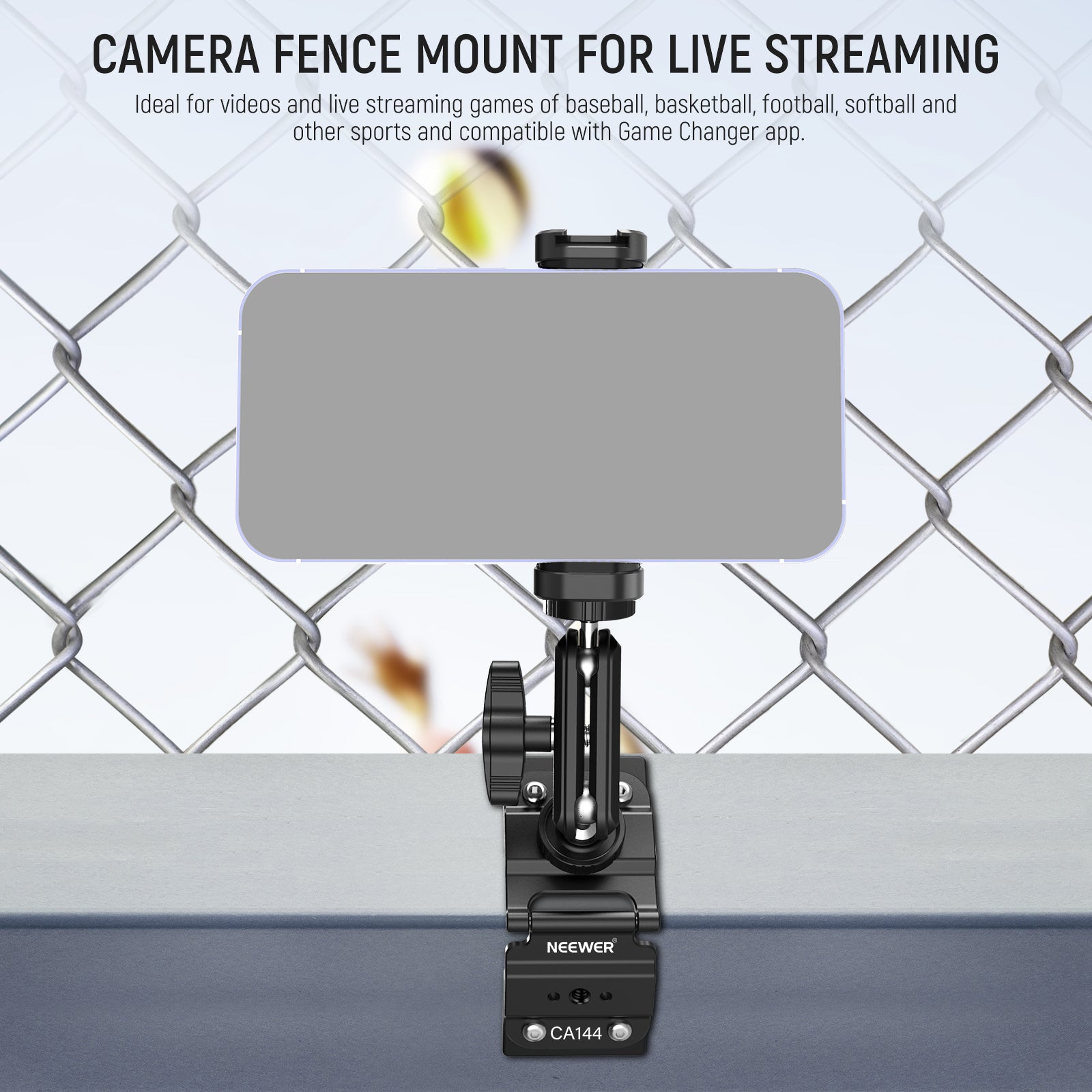 - Camera Fence Mount for Live Streaming- The magnetic camera mount securely attaches your action camera or smartphone to fence posts, with a dual ball head magic arm for flexible angles, and never miss any score keeping time. Ideal for videos and live streaming games of baseball, basketball, football, softball, tennis, volleyball, soccer, lacrosse, and other sports with this camera & phone fence mounting kit, compatible with Game Changer app. Max Load 2.2lb/1kg