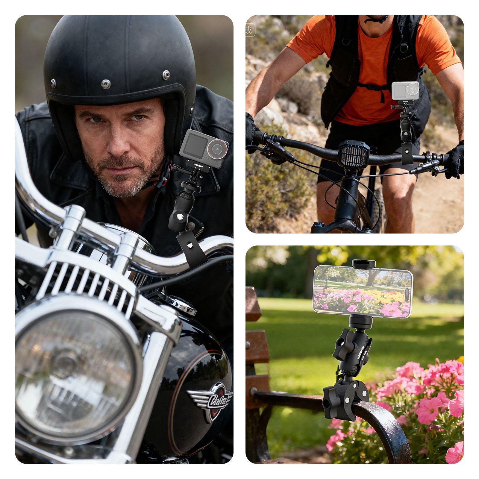 - Super Clamp Camera Mount- The magic arm features a super clamp on one end and a 1/4" screw on the other, allowing you to securely attach your devices to tubular or flat surfaces, thanks to the included action camera mount and smartphone holder. With dual 360° ball heads, it supports multiple angle adjustments, making it especially useful for quickly adding or repositioning gear during photo shoots or video recordings