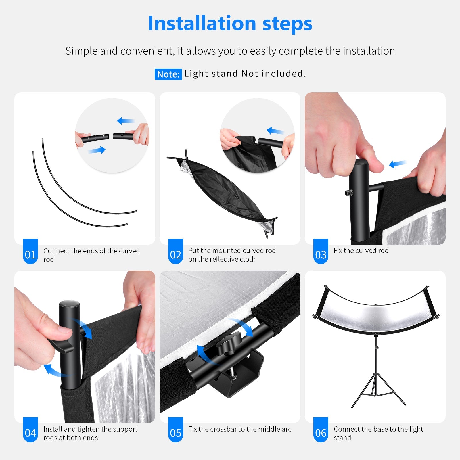 - Tool-Free Assembly- Six interlocking curved tubes, two rugged metal rods, and screw knobs enable you to assemble the frame in minutes without any tool needed. The curved tubes and rods can smoothly slip through the rod pockets and stretch the reflector taut
