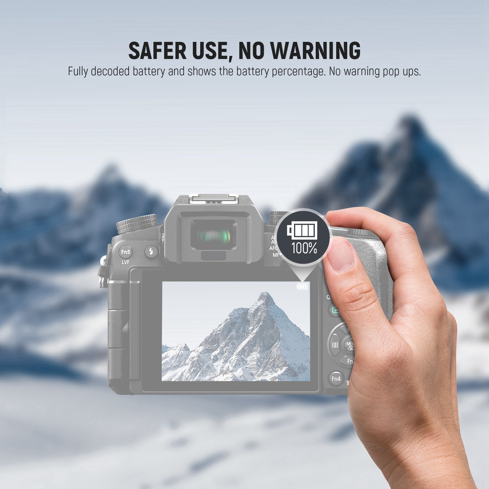 - Replacement Battery for DMW-BLC12- Fully compatible with Lumix DMC-G7 DMC-G85 DMC-G5 DMC-FZ300 DMC-FZ2500 DMC-FZ1000 DMC-GH2 DMC-FZ200 DMC-G6 DMC-GX8 DC-G90 Sigma FP FP L V-LUX 5, this decoded battery provides a consistent and stable battery level. The battery percentage will be shown on the camera screen. Note: Fully discharge the battery before charging it for the first time.