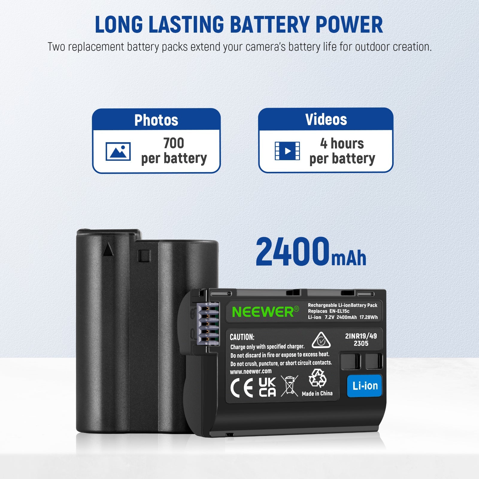 - 2400mAh EN-EL15c Replacement Batteries- These batteries offer an impressive capacity of 2400mAh and operate at a reliable 8.4V. They utilize advanced Li ion cells to deliver long lasting performance without experiencing any memory effect