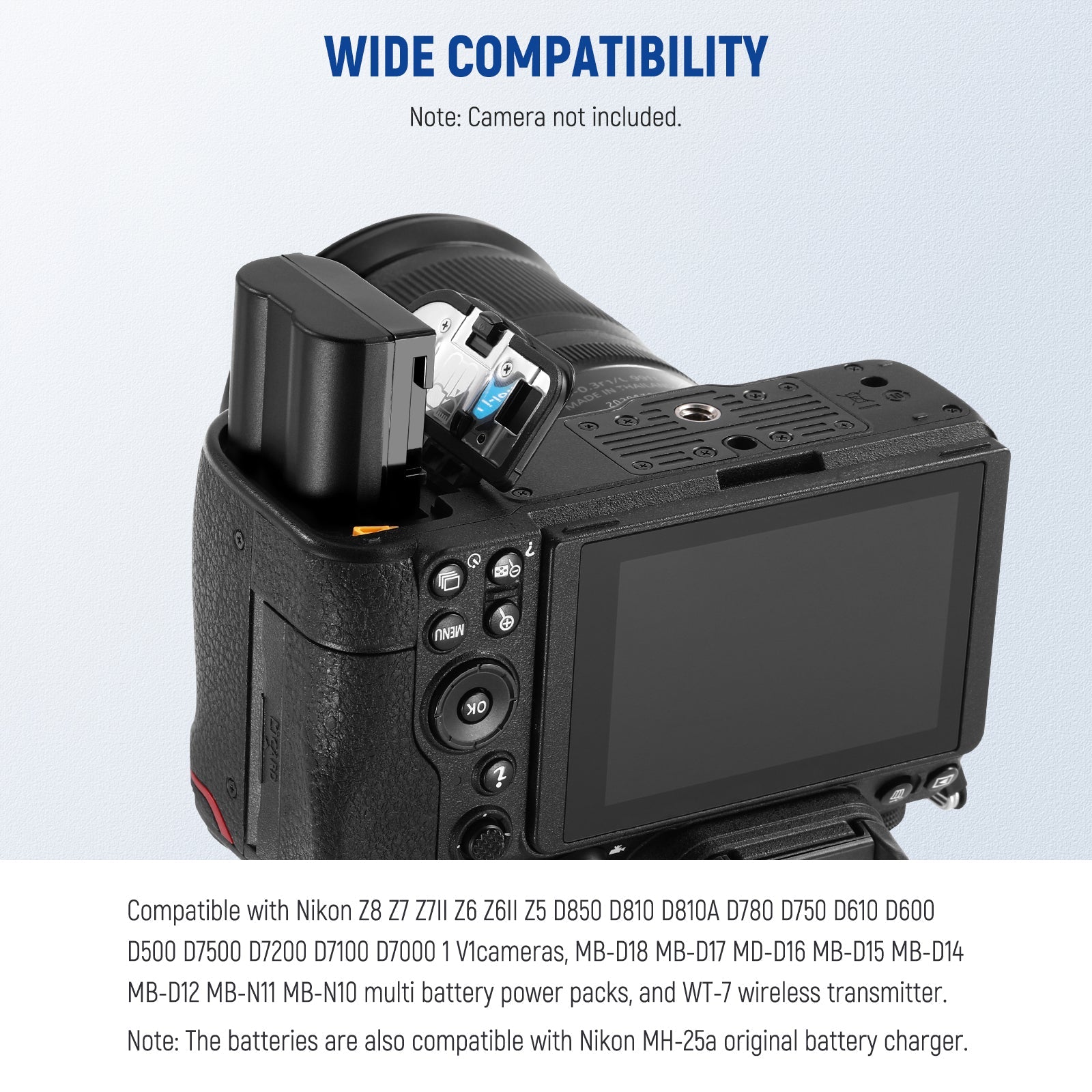 - Seamless Compatibility- Compatible with Nikon Z8 Z7 Z7 II Z6 Z6 II Z5 D850 D810 D810A D780 D750 D610 D600 D500 D7500 D7200 D7100 D7000 1 V1cameras, MB-D18 MB-D17 MD-D16 MB-D15 MB-D14 MB-D12 MB-N11 MB-N10 multi battery power packs, and WT-7 wireless transmitter. The batteries are also compatible with Nikon MH-25a original battery charger