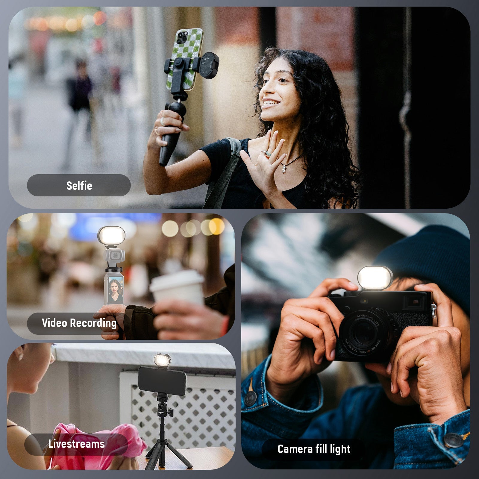 - Mini Camera Video Light- Measuring only 1.97"x1.38"x0.55"/5x3.5x1.4cm and weighing just 0.71oz/20g, this panel light attachment won't weigh down your camera, providing soft, flattering lighting to enhance your on camera appearance. Compact enough to slip into a pocket for easy carrying, it's portable equipment for travel films, on the go vlogs, selfie photos, photography, video recording, studio photoshoot, key light for YouTube TikTok social media short filming, streaming, makeup, and more