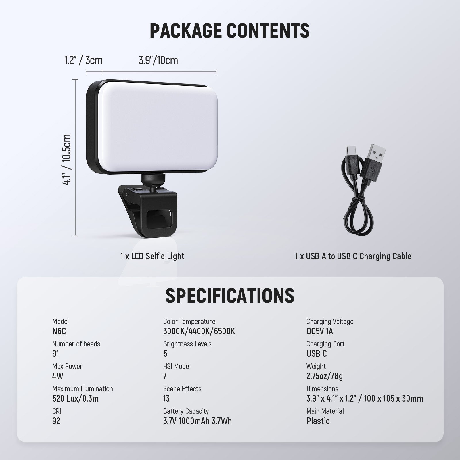 - Versatile Photography Lighting Kit- Includes 1 x RGB selfie light, 1 x mounting clip, and 1 x USB A to USB C charging cable. This LED light brightens up your skin and make you look better on camera, whether you are attending a Zoom meeting, live streaming on social media, filming a vlog for your YouTube/TikTok channel, making podcast videography as a content creator, or simply looking for a makeup light as a makeup artist