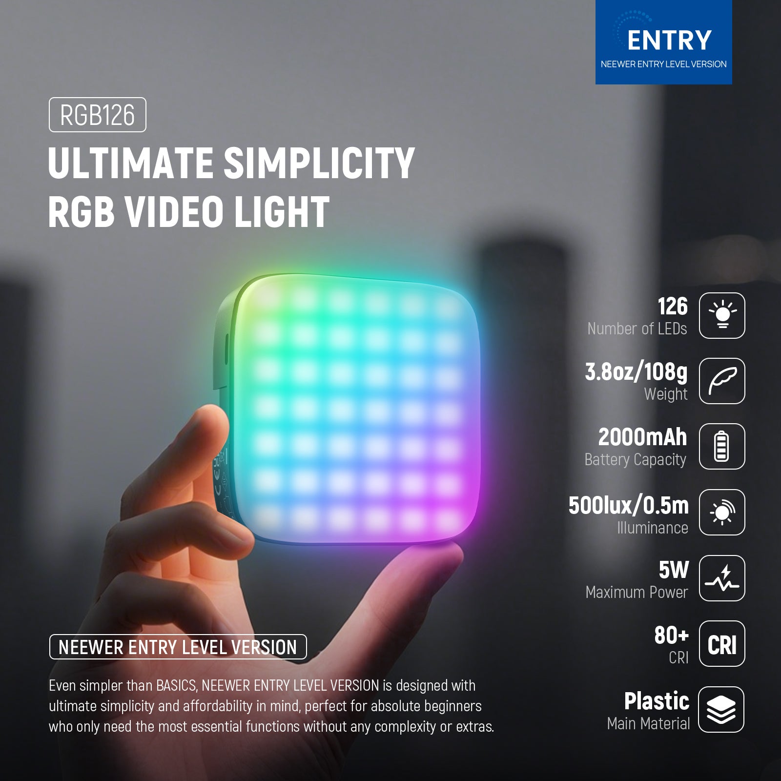 - Introducing NEEWER ENTRY LEVEL VERSION- Even simpler than BASICS, NEEWER ENTRY LEVEL VERSION is designed with ultimate simplicity and affordability in mind, perfect for absolute beginners who only need the most essential functions without any complexity or extras. Note: When used while charging, the RGB126's power automatically drops to 3.5W