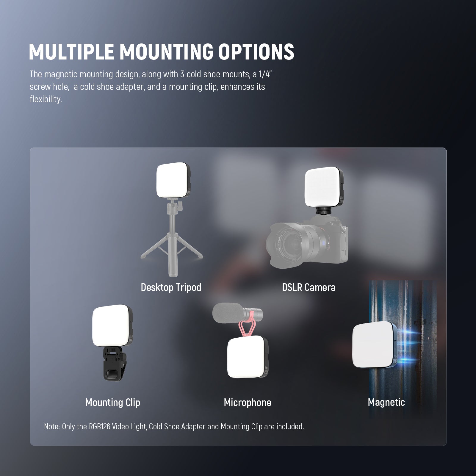 - Multiple Mounting Options- Attach it to any magnetic metal surface via the built in magnets on the back. Or mount it on light stands, tabletop tripods, or cameras via the 1/4" screw hole and the cold shoe adapter. The three additional cold shoe mounts on the edges provide options for connecting camera or photography videography accessories like microphones and LED lights. Also includes a mounting clip for attaching to a phone, laptop, and PC for video conferencing, zoom calls, etc