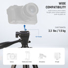 - Metal Build Travel Tripod- Made of heavy duty aluminum alloy, the lightweight tripod with phone holder attachment securely mounts a DSLR (compatible with Canon Sony Nikon cameras), action camera (adapter not included) or smartphone up to 3.3lb/1.5kg for selfies, vlogging creation, live streaming, filmmaking, etc. At 1.25lb/568g, the portable tripod folds down to 16.9"/43cm, with the included carrying bag for photography on the go. The mid spreader helps with instant setup and ensures stability