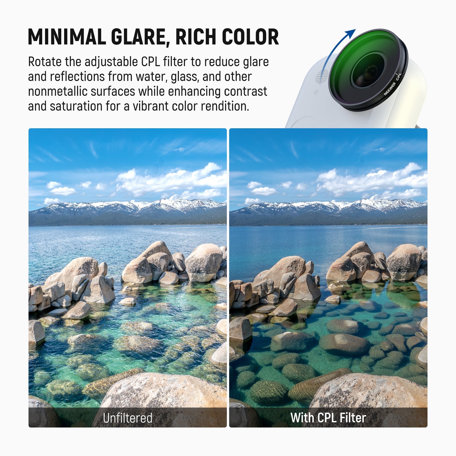 • Minimal Glare, Rich Color- Rotate the adjustable CPL filter to reduce glare and reflections from water, glass, and other nonmetallic surfaces while enhancing contrast and saturation for a vibrant color rendition