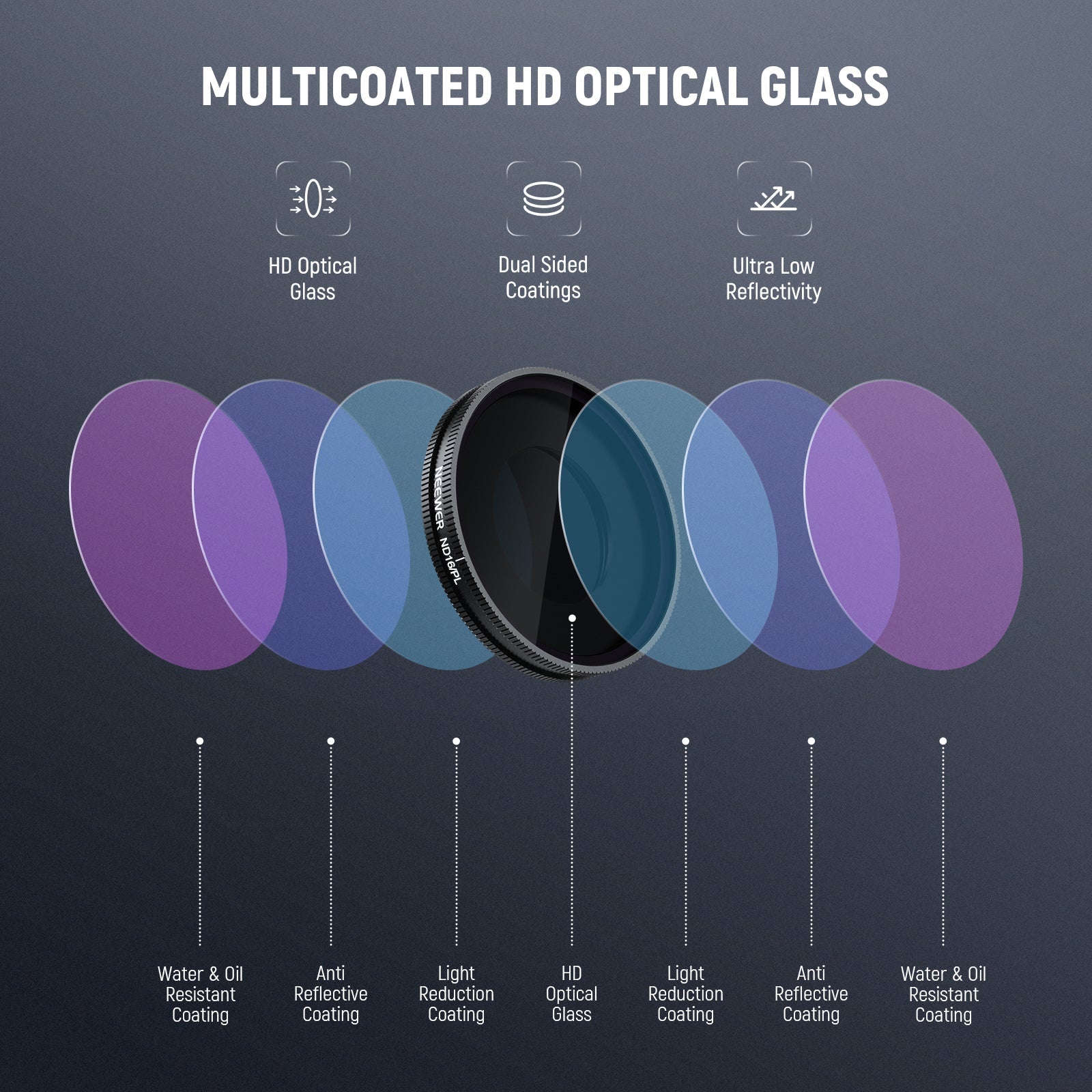 • Flexible Exposure Balance- Neutral density filters reduce light by 3, 4, 5, and 6 stops respectively to prevent overexposure in different lighting conditions and allow you to capture rivers, waterfalls, and light trails with smooth motion blur