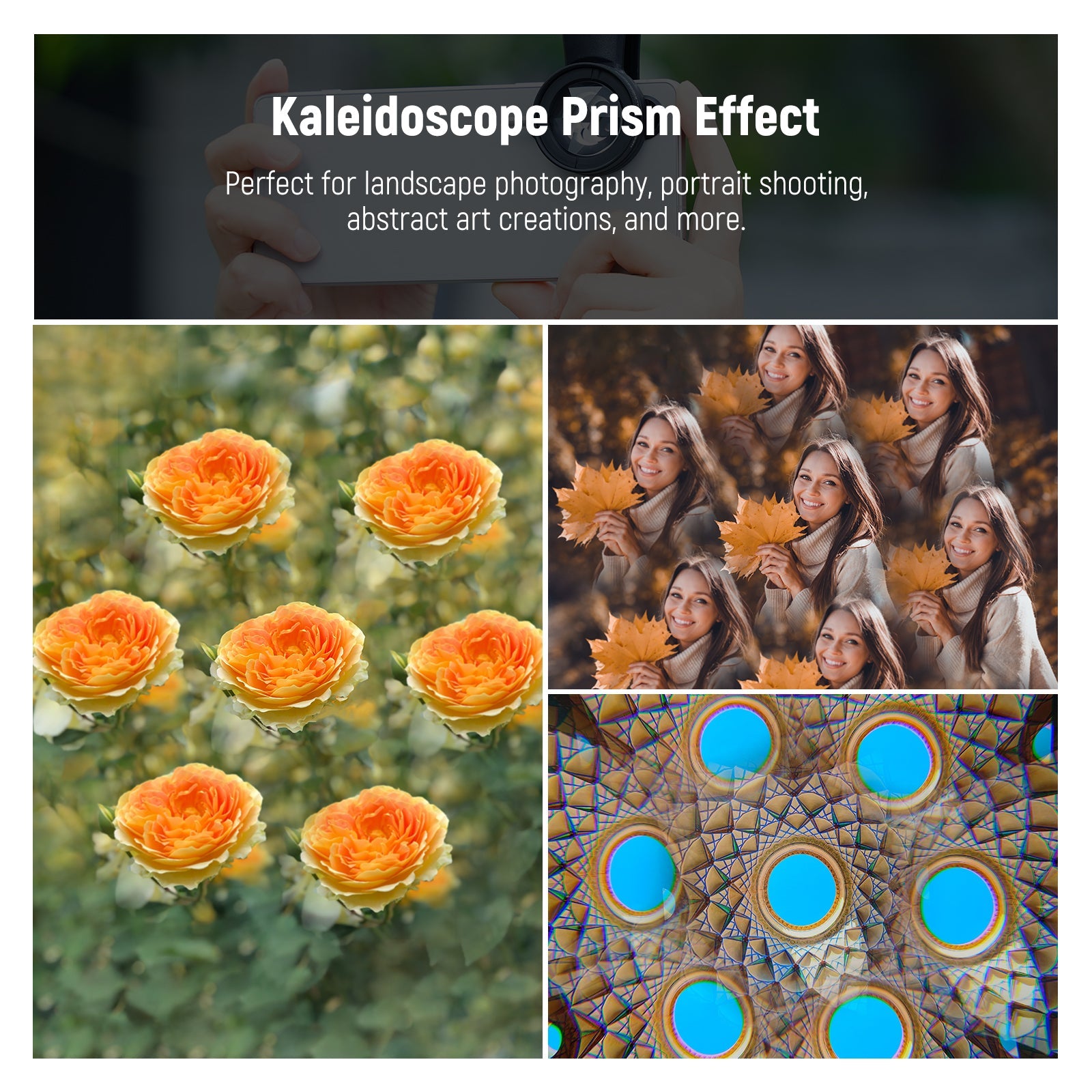 - Creative Kaleidoscopic Effect- The kaleidoscope prism lens filter bends and refracts light to create duplicated and circular elements in the camera. By changing angles, it also scatters light and creates a hypnotic and surreal kaleidoscopic effect