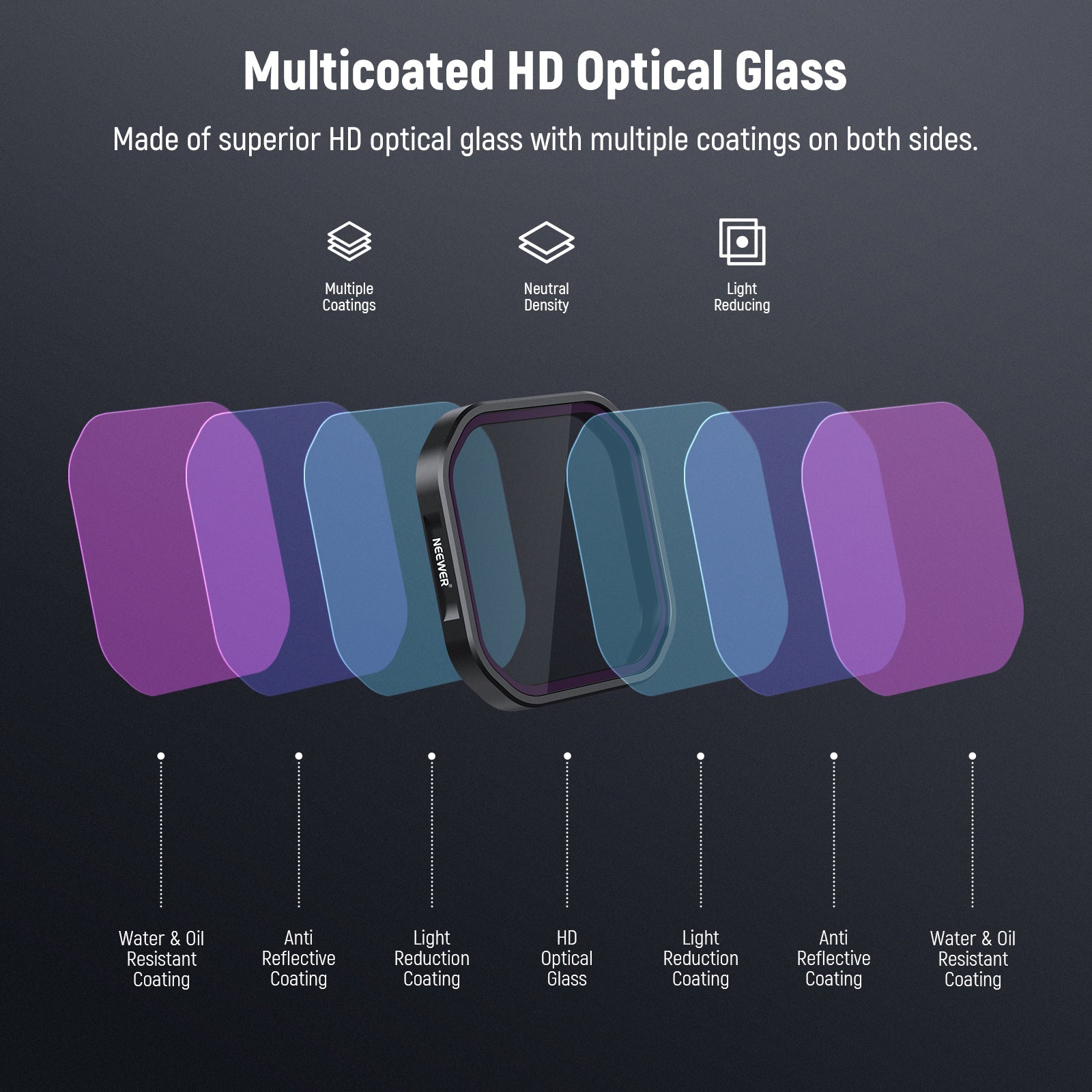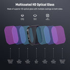 - Multicoated HD Optical Glass- HD optical glass ensures high clarity and accurate color reproduction. Multiple coatings on both sides of the glass are resistant to water, fingerprints, smudge, and scratches, making filters easy to clean (a cleaning cloth included)