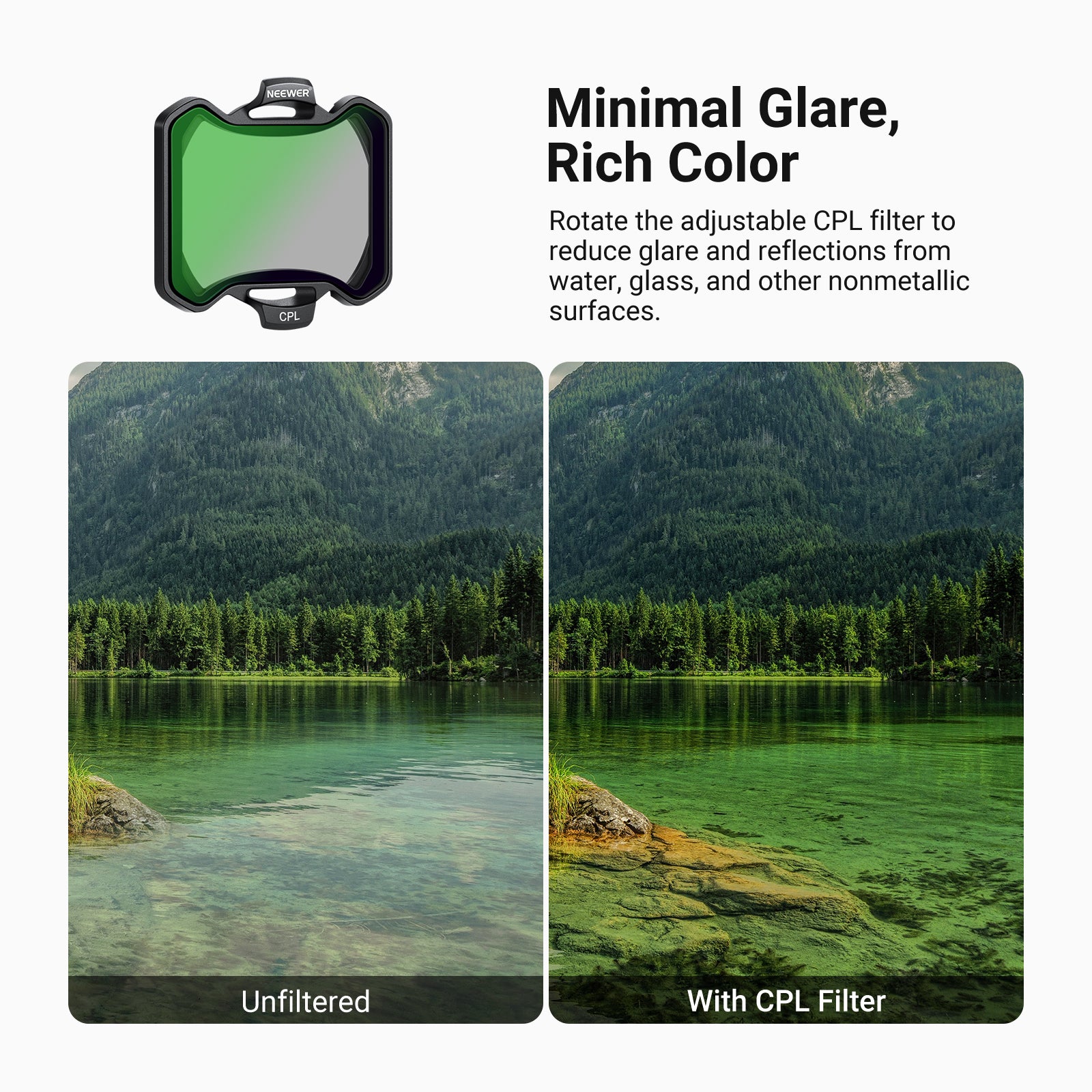 - Combination of ND & PL Filters- Combining ND and PL functions, ND/PL filters enhance exposure control and improve color, contrast, and detail in your images while effectively reducing glare and reflections. By simplifying your equipment kit and workflow, they are ideal for outdoor video recording and landscape photography