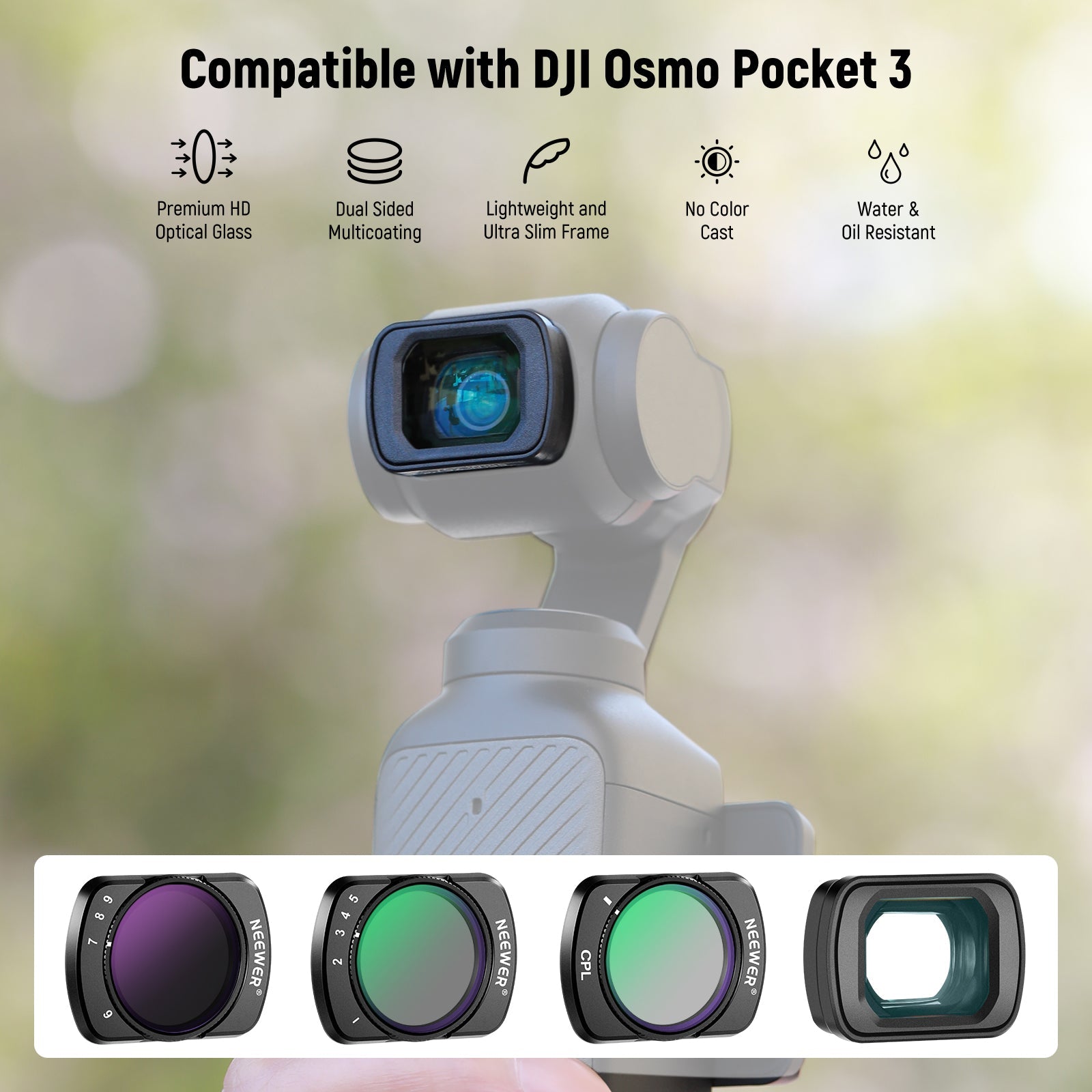 - Compatible with DJI Osmo Pocket 3- This filter and lens accessories kit is designed for Osmo Pocket 3 Gimbal Camera gear. It offers two variable neutral density (ND) filters (ND2-32 & ND64-512), a CPL (circular polarizer) filter, and a 0.75X wide angle lens to enhance gimbal photography and action video recording as content creator essential and influencer must have