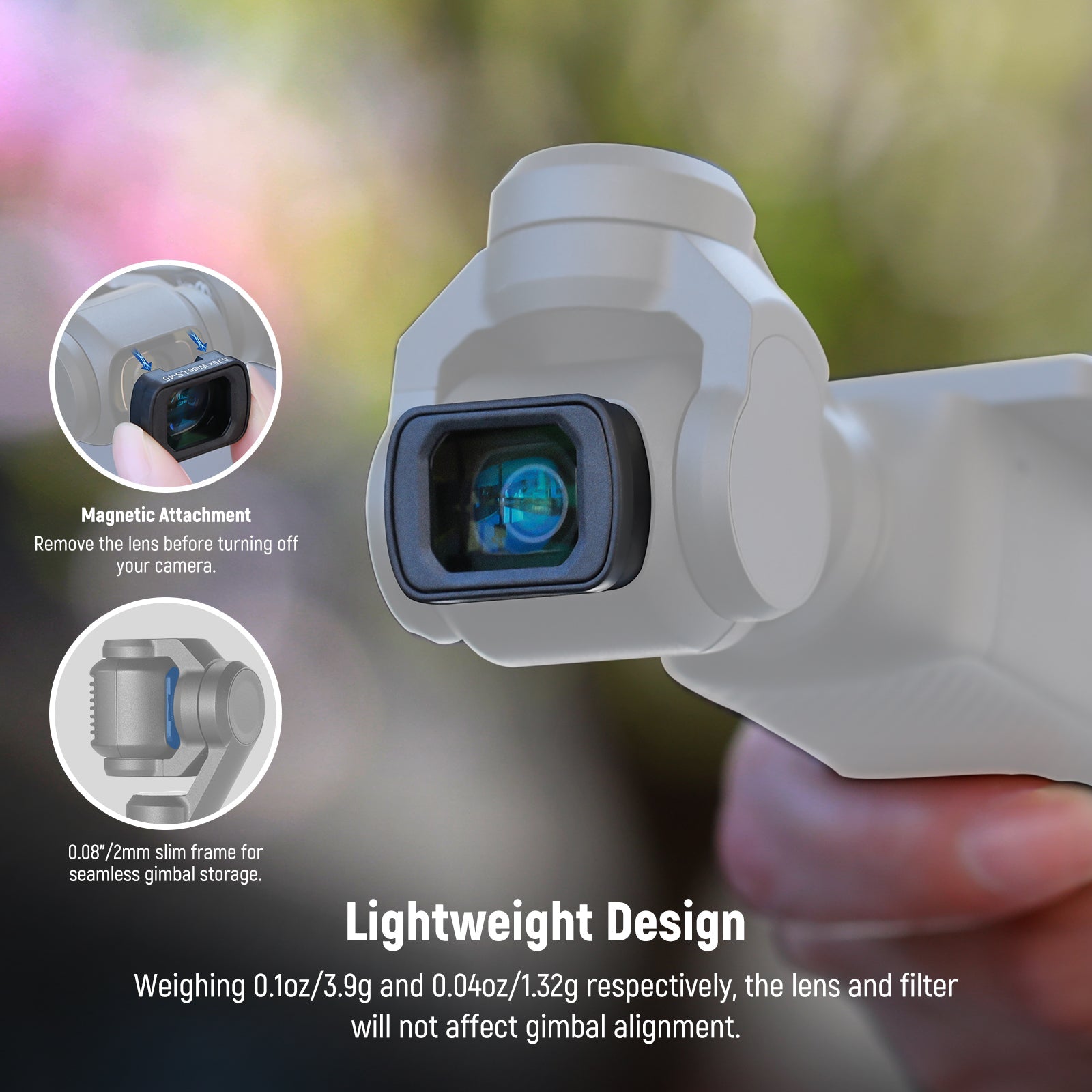 - Aspherical 0.75X Wide Angle Lens- The 0.75X wide angle lens can expand the field of view (FOV) to 108° and create a slightly distorted effect for creative shots, perfect for landscape, street photography, and group portraits. The highly transmissive aspherical lens construction delivers exceptional clarity. Note: Remove the lens before gimbal storage. Do not stack the lens and filters