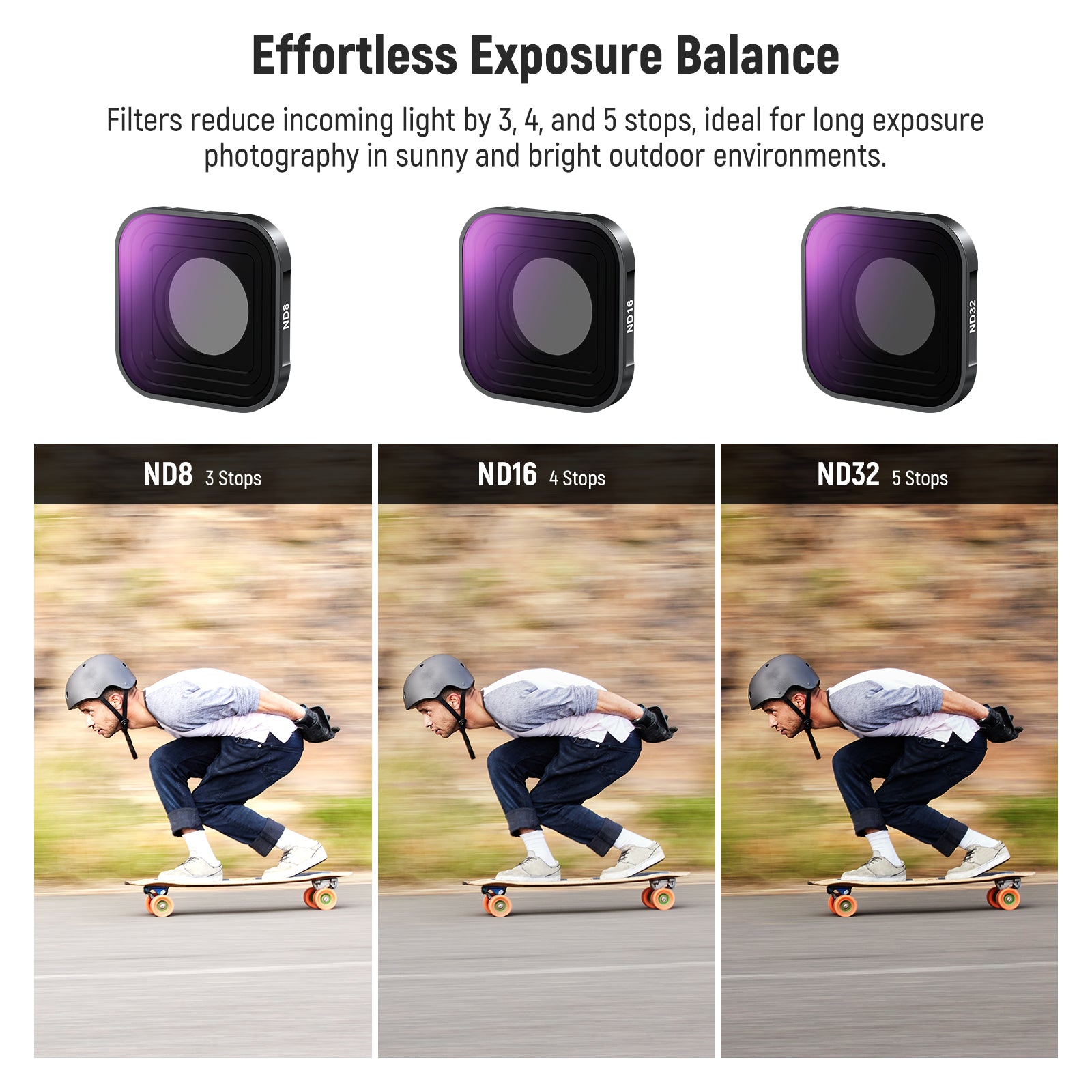 - Effortless Exposure Balance- ND4, ND8, ND16, and ND32 filters reduce the light by 2, 3, 4, and 5 stops respectively, suitable for long exposure photography on sunny and bright days. They allow you to shoot at slower shutter speeds with larger apertures and capture moving subjects with cinematic motion blur effects