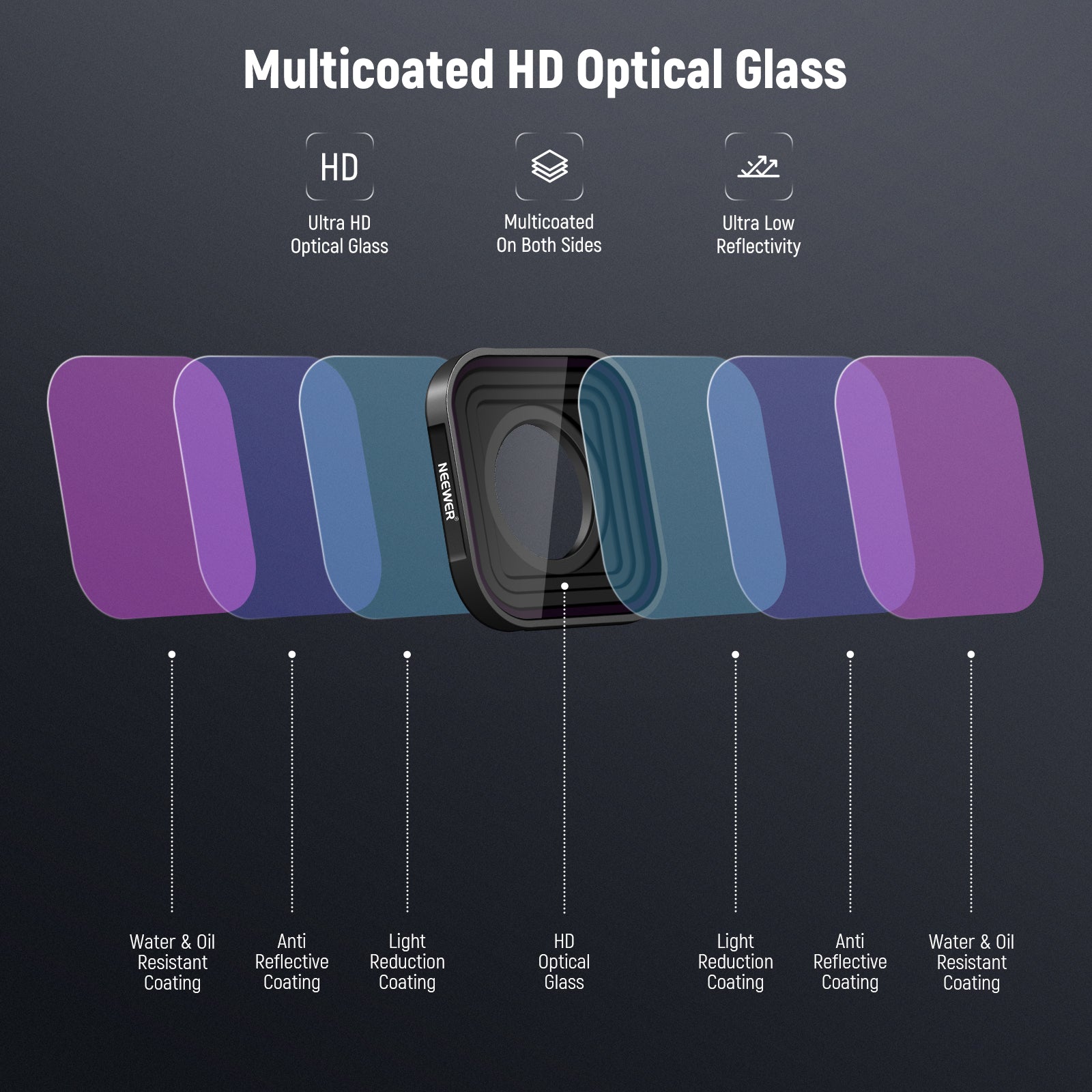 - Multicoated HD Optical Glass- HD optical glass delivers exceptional clarity and color fidelity. Multiple coatings on both sides are resistant to water, fingerprints, smudges, and scratches, ensuring high durability and easy cleaning during outdoor shooting