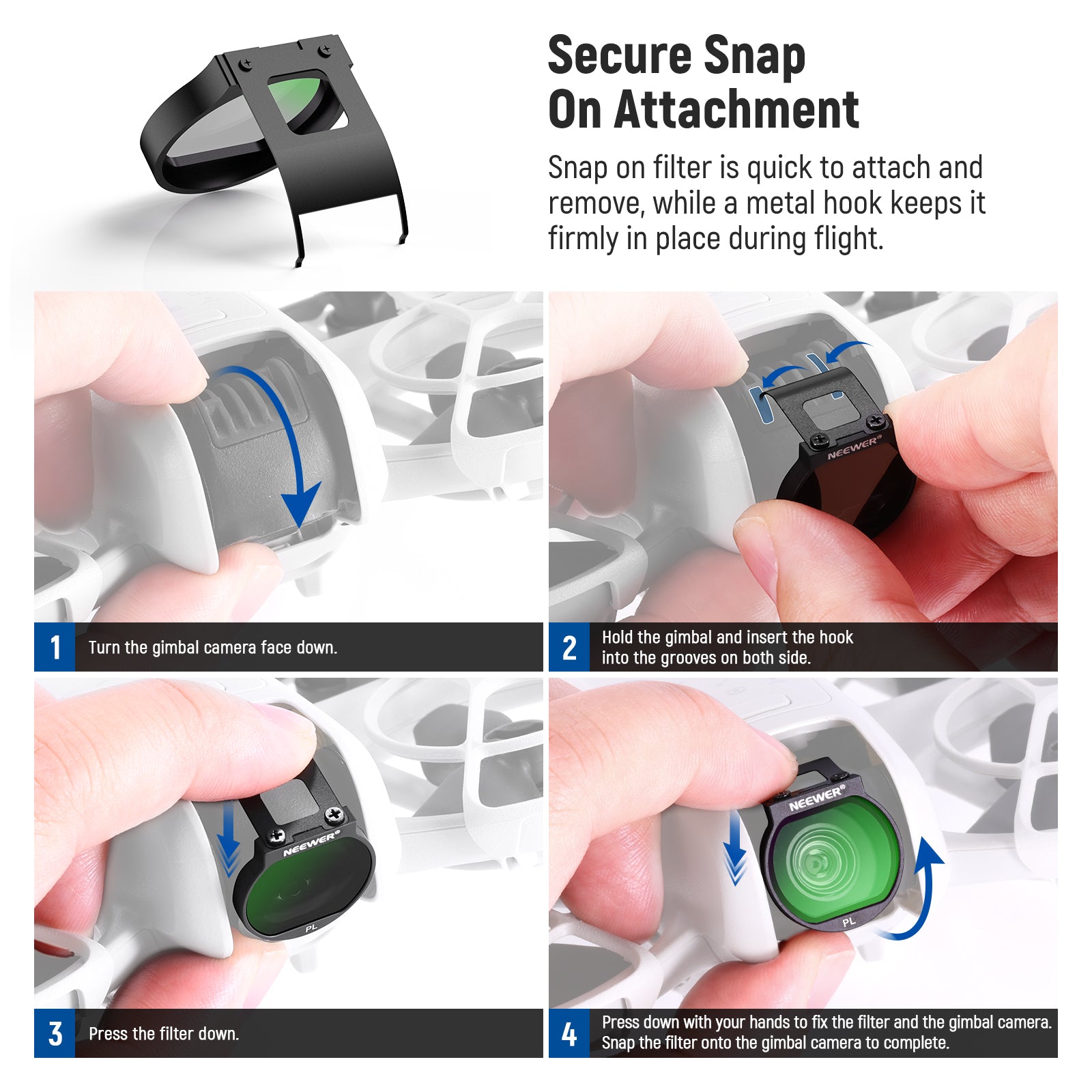 - Secure Snap On Attachment- Snap on filter is quick to attach and remove, while a metal hook keeps it firmly in place during flight. The slim design prevents vignetting on camera and will not affect the use of the gimbal protector