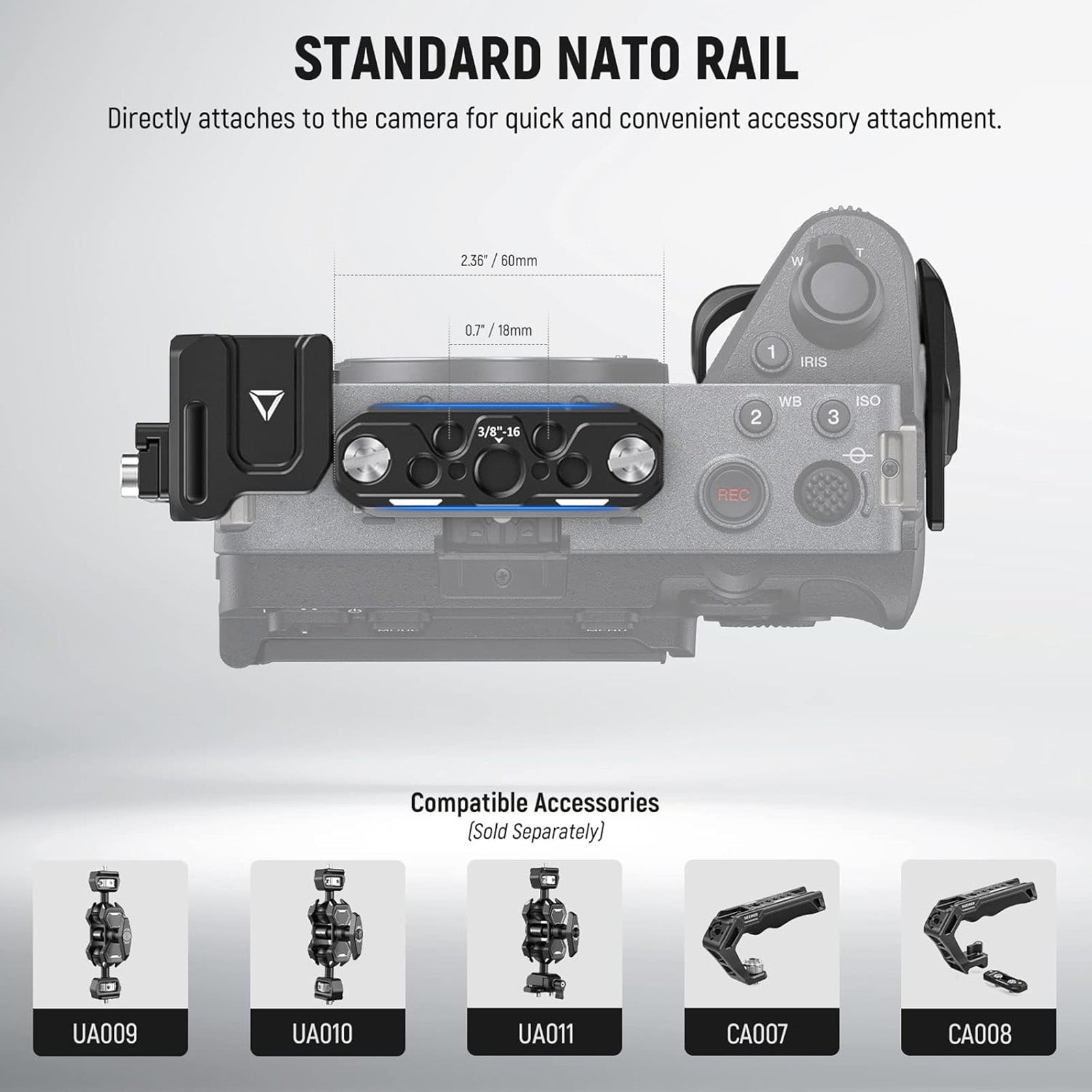 - NATO Rail for Fast Connection- Mounted on top of the FX3/FX30 camera via two 1/4" screws, the NATO rail with quick release lets you instantly yet safely install compatible accessories, such as top handles, clamps, monitor mounts, and magic arms to the camera. Note: The spacing between two 1/4" holes is 27mm, so it is not for accessories with an 18mm hole spacing