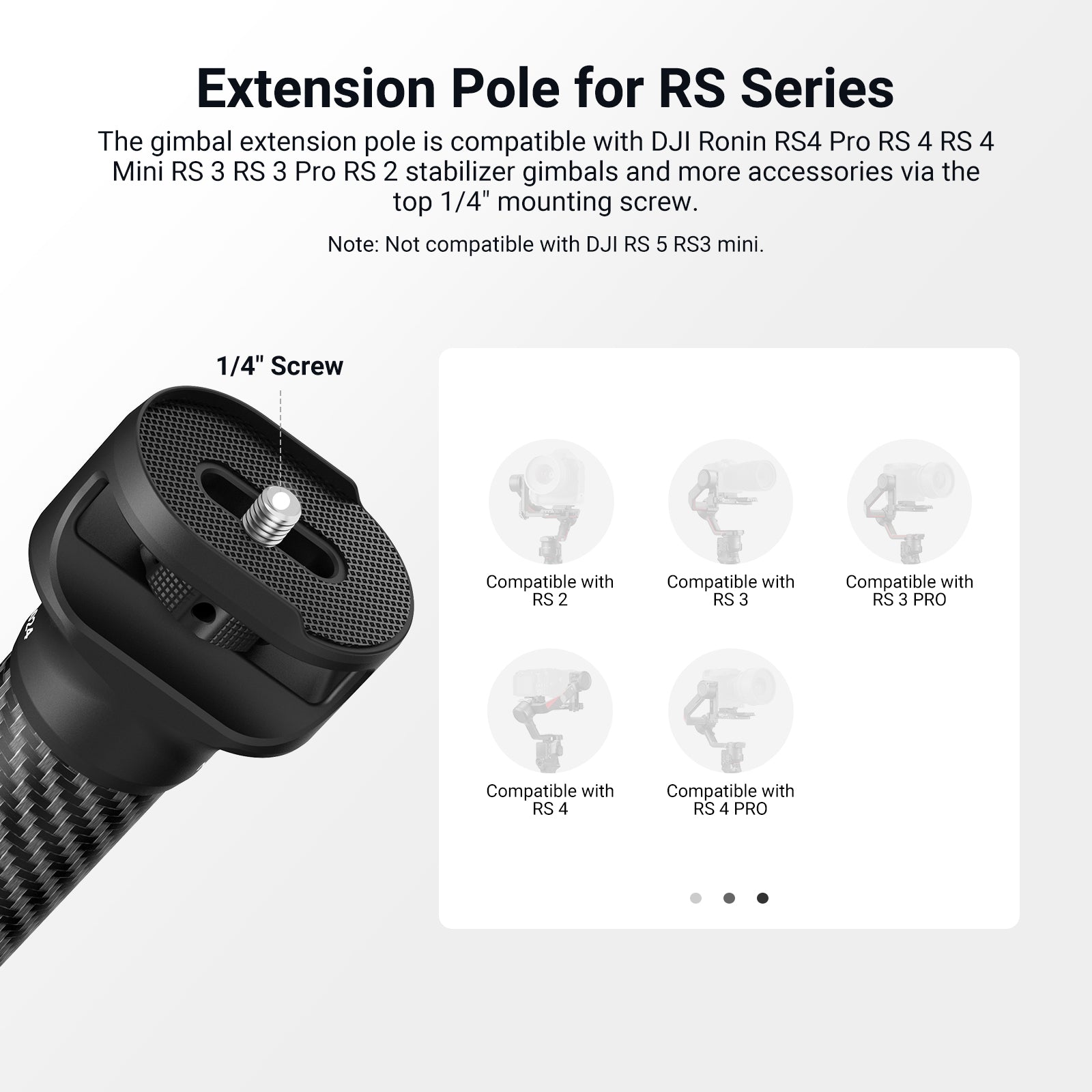 Extension Pole for RS Series- The gimbal extension pole is compatible with DJI Ronin RS4 Pro RS 4 RS 4 Mini RS 3 RS 3 Pro RS 2 stabilizer gimbals and more accessories via the top 1/4" mounting screw. Note: Not compatible with DJI RS5 RS3 mini