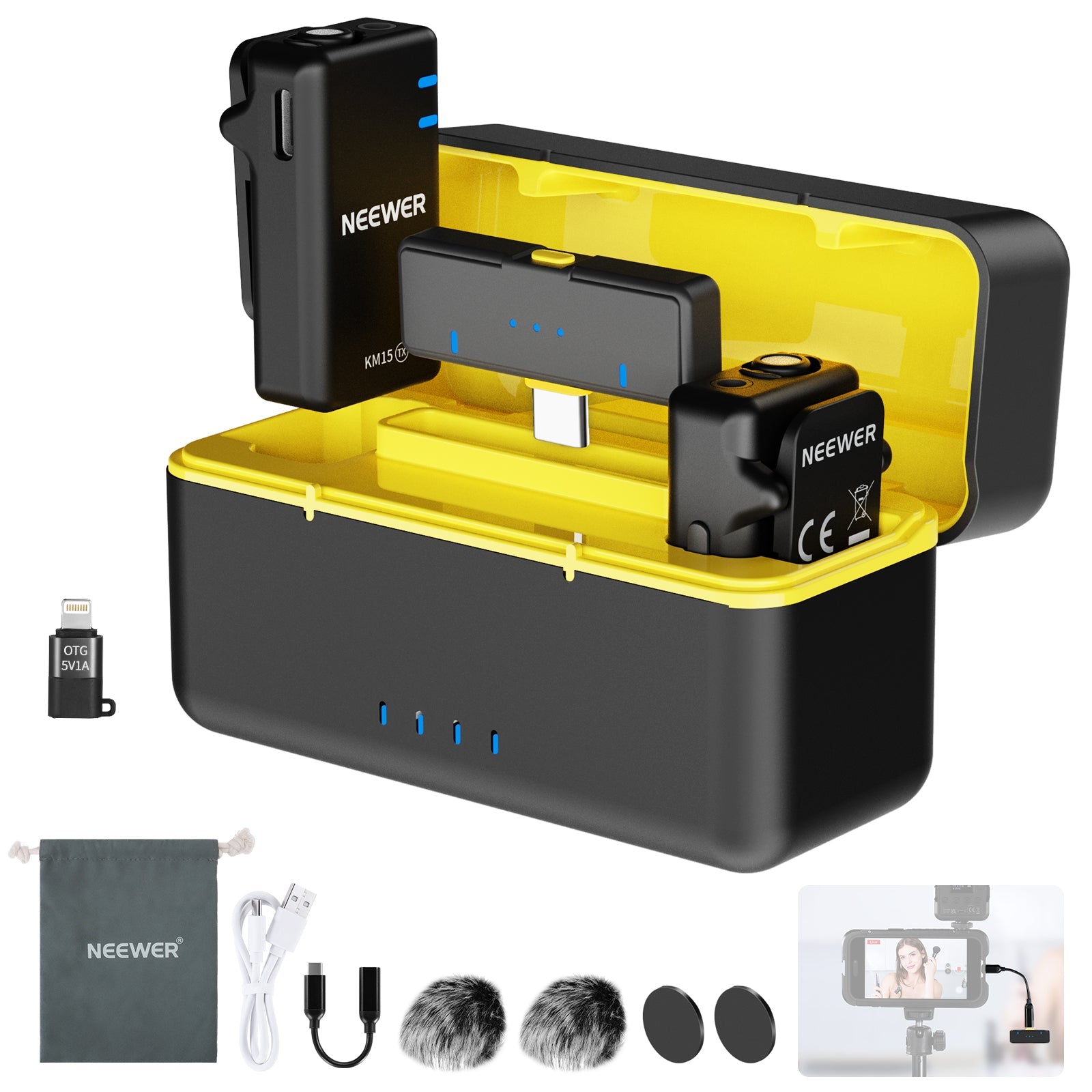 - Mini Wireless Lavalier Lapel Mic- This wireless microphone system features two transmitters (TX) with a MUTE button and SET button for photo capture (double press), a USB C receiver (RX) that offers 3 volume levels, and a portable charging case. Upgraded with a 48kHz/24bit sampling rate and 76dB signal to noise ratio, also compatible with NEEWER CM28 Max