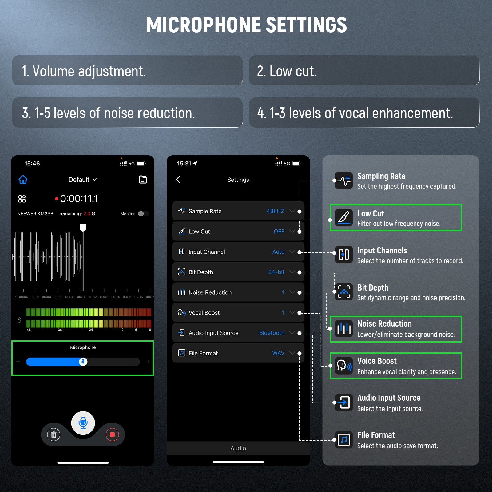 - Versatile Functions- Built in noise cancellation reduces background sound for clearer audio. NEEWER View app supports volume adjustment, 5 noise cancellation levels, 3 voice enhancement levels, 75Hz/150Hz/300Hz low cut, and MP3/WAV/AAC file formats