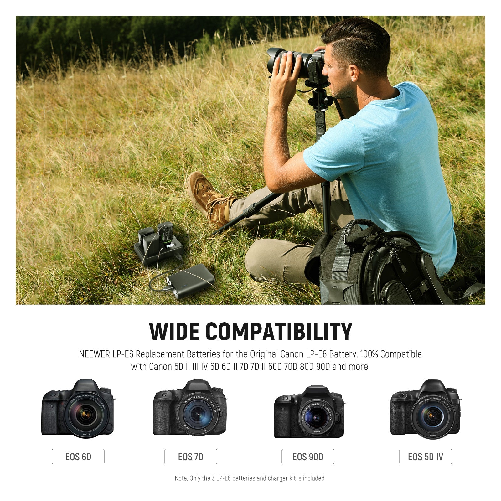 - Fully Compatible with Canon Camera Powered by LP-E6 Battery- NEEWER LP-E6 replacement batteries are fully compatible with Canon EOS 5D Mark II 5D Mark III 5D Mark IV 5D SR 60D 60Da 6D 70D 7D cameras and other devices powered by LP-E6 and LP-E6N batteries. The charger is compatible with LP-E6 LP-E6N LP-E6NH lithium ion battery packs