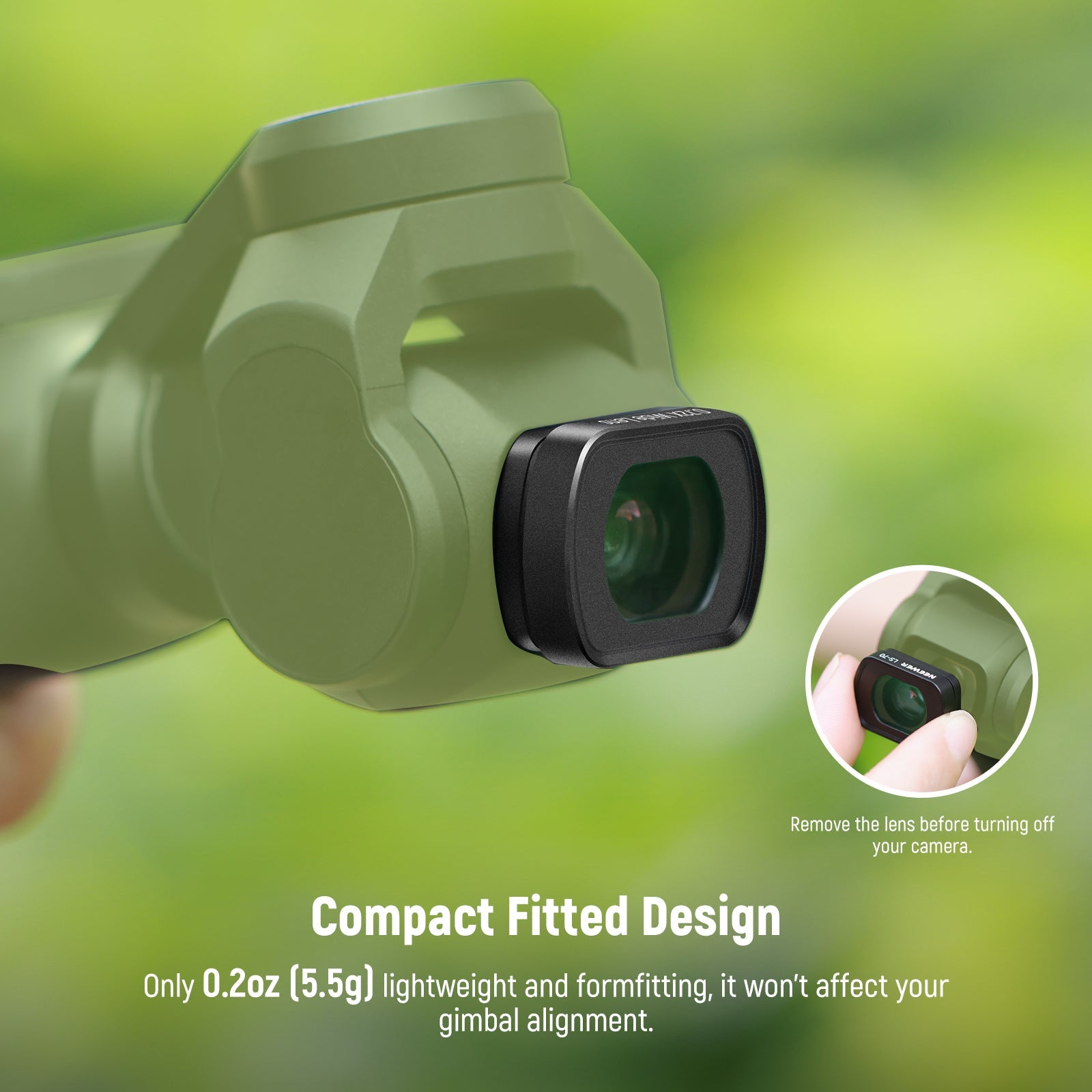 - Quick Magnetic Attachment- The installation is easy. Simply snap this lightweight (0.2oz/5.4g) magnetic lens onto the camera and start shooting. Note: Remove the lens before gimbal storage