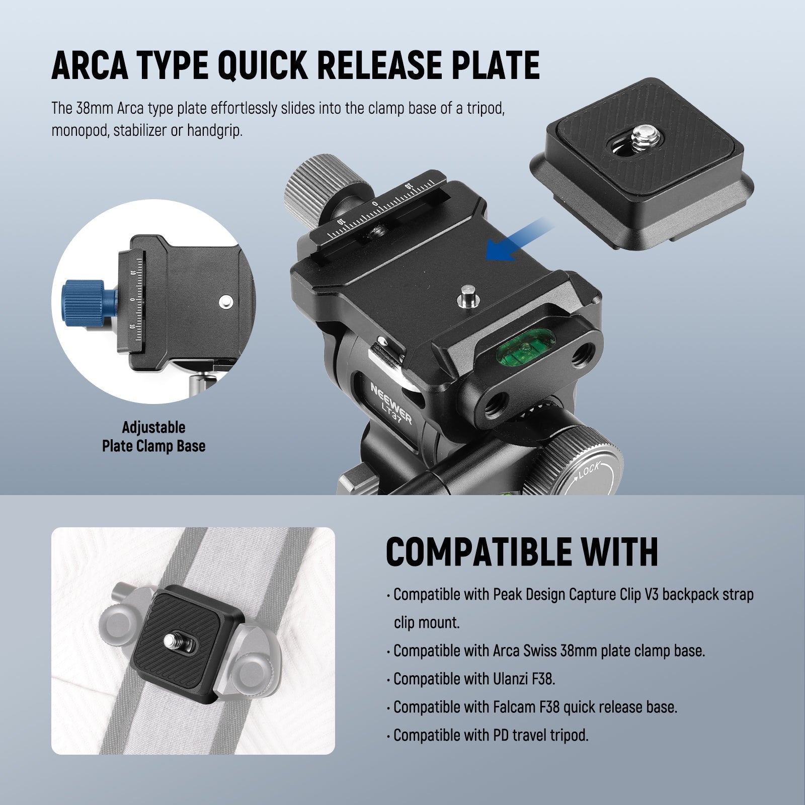 - Arca Type Quick Release Plate- The 38mm Arca type plate effortlessly slides into the clamp base of a camera tripod, monopod, stabilizer or handgrip. Compatible with Peak Design Capture Clip V3 backpack strap clip mount compatible with Arca Swiss 38mm plate clamp base compatible with Ulanzi F38 compatible with Falcam F38 quick release base, allowing for quick swaps between a backpack strap and a tripod, compatible with PD travel tripod. A hidden L shaped hex key is also included