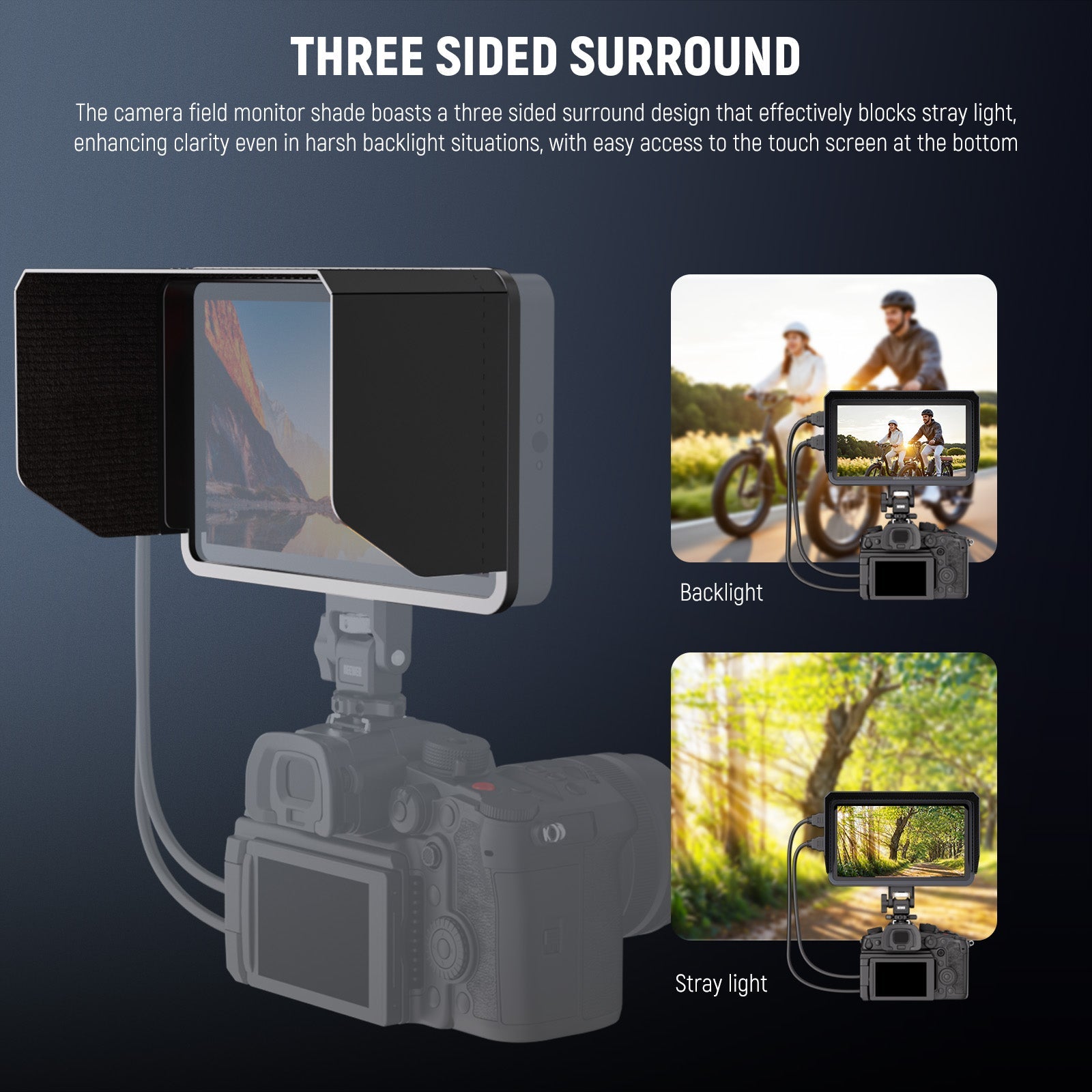 - Three Sided Surround- The camera field monitor shade boasts a three sided surround design that effectively blocks stray light, enhancing clarity even in harsh backlight situations, with easy access to the touch screen at the bottom