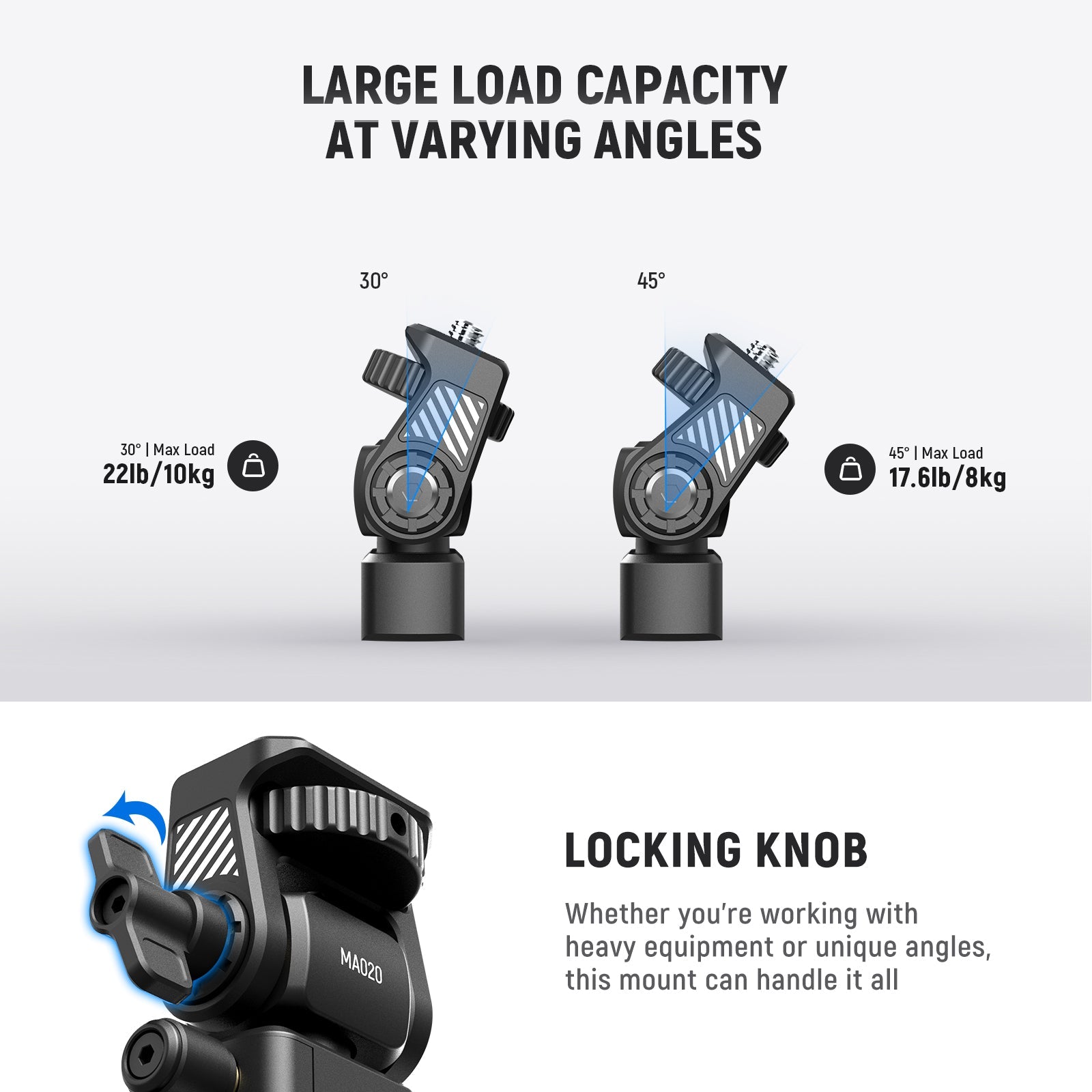 - Adjustable 360° Swivel & 180° Tilt- This field monitor holder offers 360° swivel and 180° tilt with adjustable damping for precise and flexible positioning based on different weight and tilt angles. The side knob enables a quick adjustment simply by hand