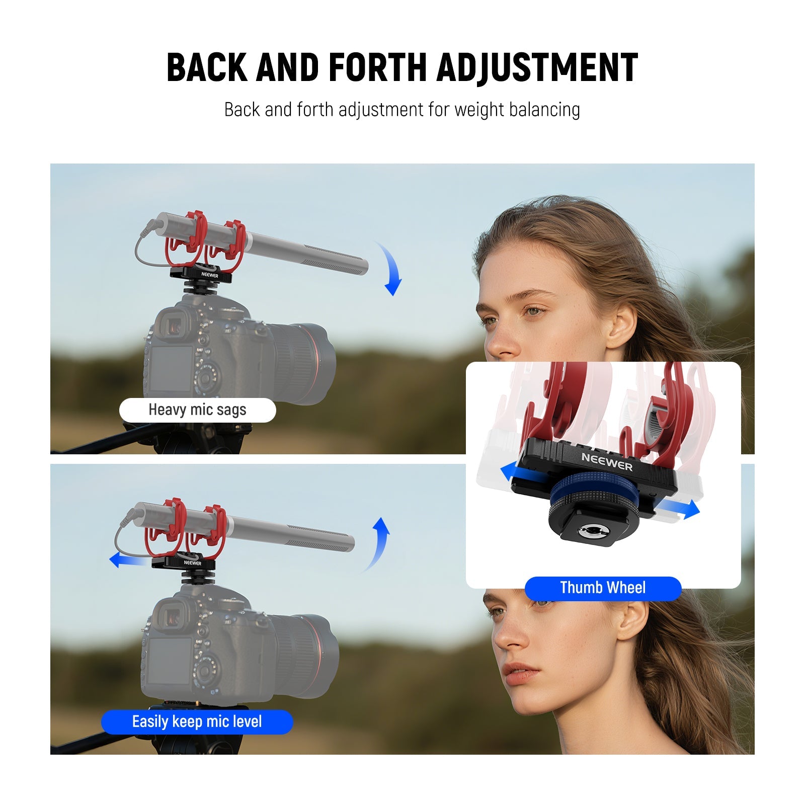 - Universal Cold Shoe & 1/4" Thread- The cold shoe mount and 1/4" thread can connect to cameras, rigs, boom poles, and tripods. It also supports back and forth positioning for weight balancing