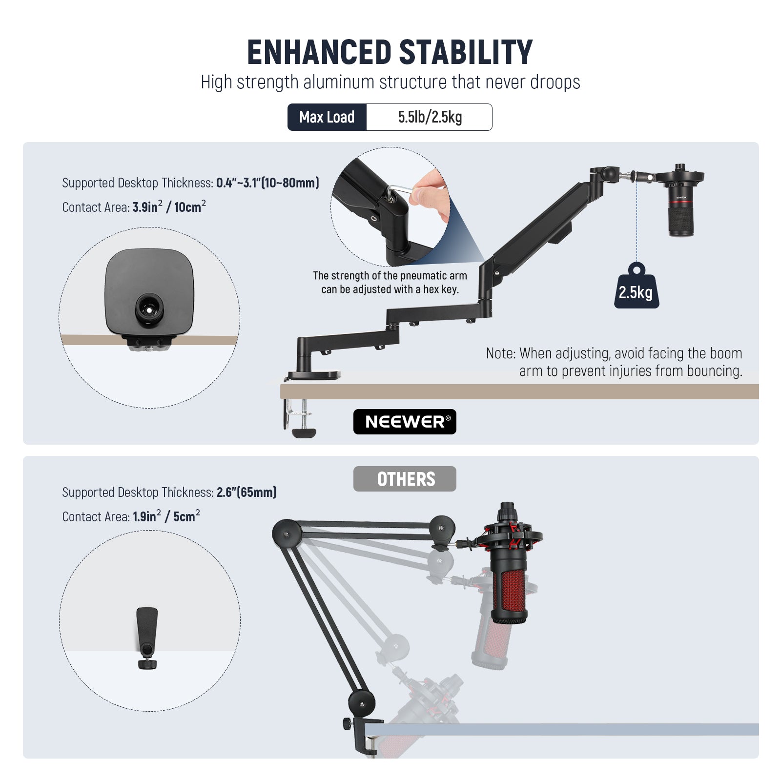 - Professional Pneumatic & Spring Loaded Boom Arm- Featuring an advanced pneumatic balancing system and integrated spring loads, the boom arm is engineered for swift and stable positioning, even with heavier microphones (rebound force is adjustable). It guarantees quiet, smooth microphone movement during video audio recording, live streaming, or broadcasting, with a maximum load capacity of 5.5lb/2.5kg.Note: When adjusting, avoid facing the boom arm to prevent injuries from bouncing.