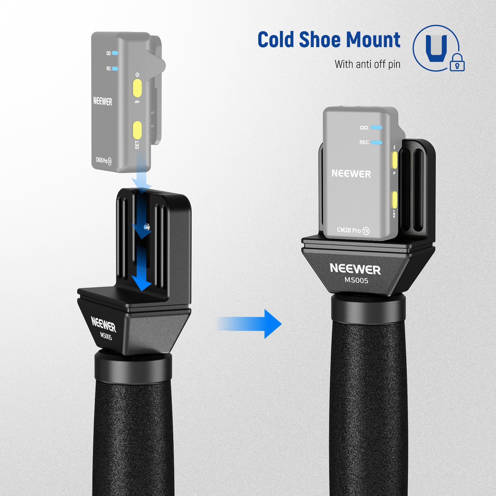 - Standard Anti Off Cold Shoe- This mic handle features an anti off cold shoe that vertically mounts your wireless lavalier and prevents it from dropping. Compatible with NEEWER CM31; compatible with RODE Wireless Go II 2; compatible with DJI Mic; compatible with Hollyland Lark 150; compatible with Synco G1/A2; compatible with SmallRig W60 and other clip on microphones with cold shoes