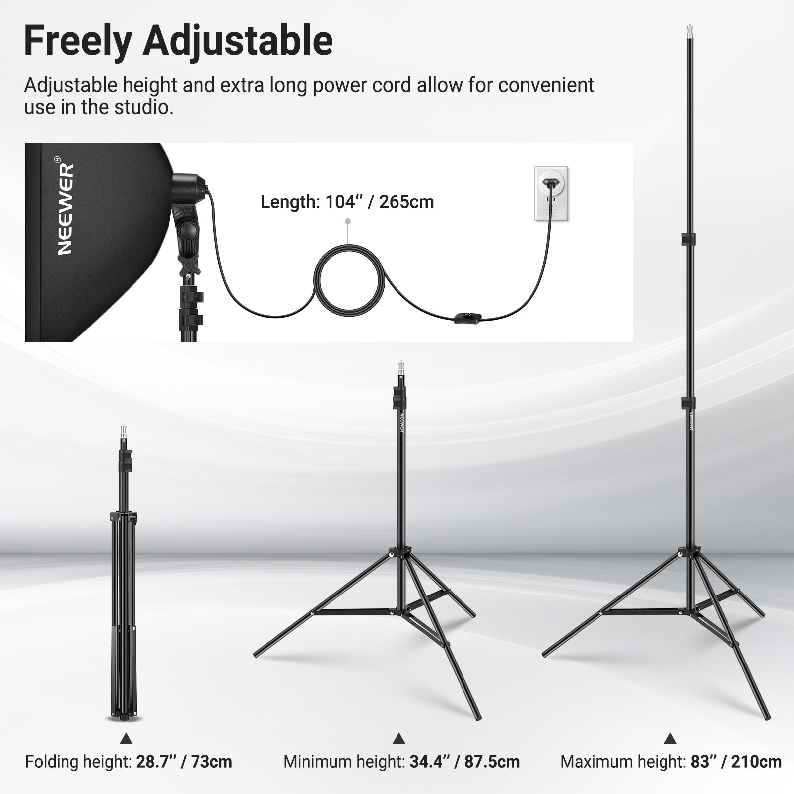 - 83"/210cm Telescopic Light Stand- Designed with 4 sections for flexible and precise height adjustment, the tripod stand extends up to 83"/210cm. Constructed from aluminum alloy, it is robust and rust resistant, providing stable support for your equipment and ensuring an effortless photography lighting setup