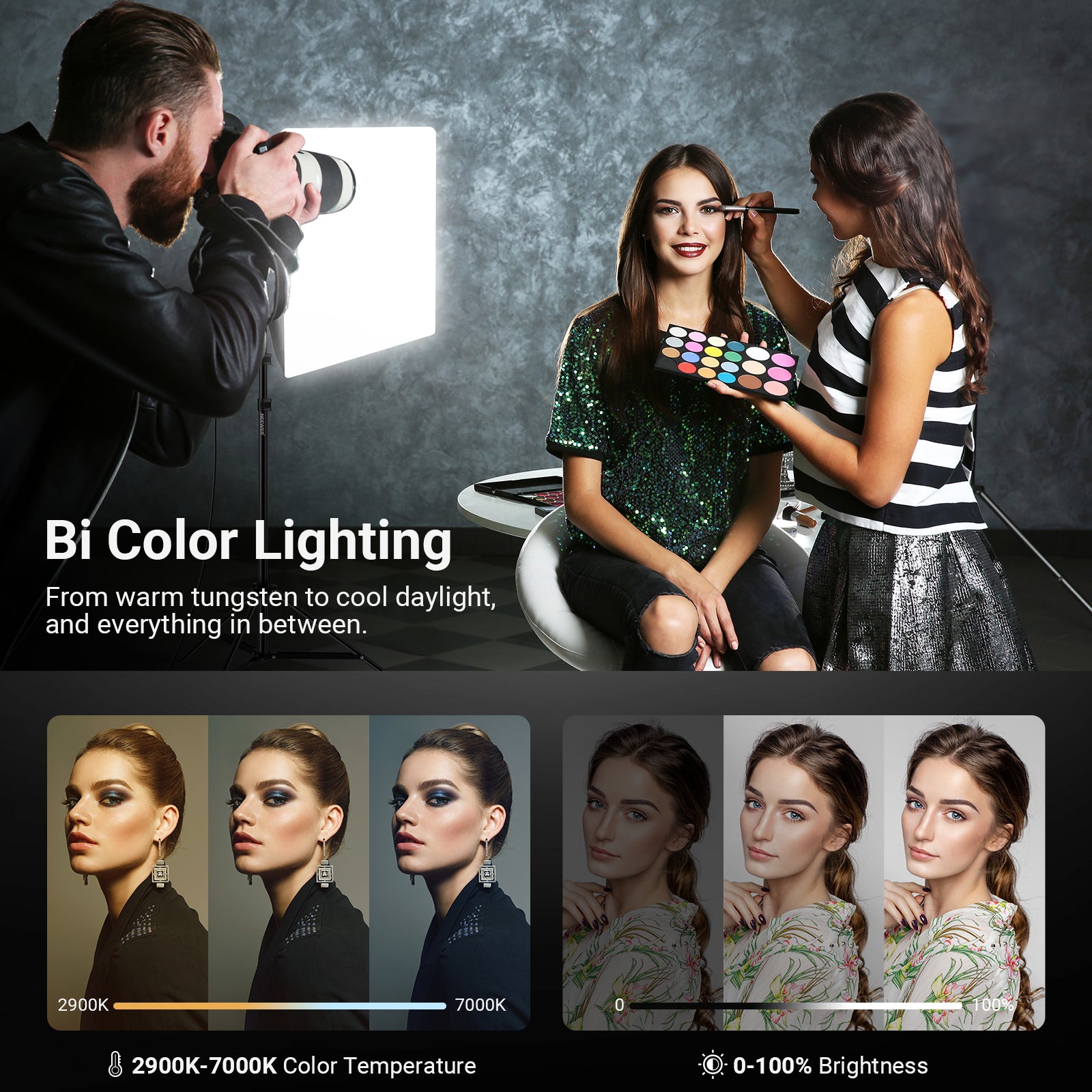 - Comprehensive Studio Lighting Kit- Includes 2 24"x24" square softboxes, 2 bi color LED bulbs, 2 adjustable light stands, a 2.4G remote control, and a carrying bag, bringing you a professional lighting setup for live streaming, portrait & product photography, photo art, and many other creative endeavors