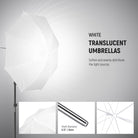 - Umbrellas for Light Reflection & Diffusion- 33" black umbrellas with silver interiors are useful for light bouncing and reflection, and white translucent umbrellas can soften the light source and spread it with even distribution