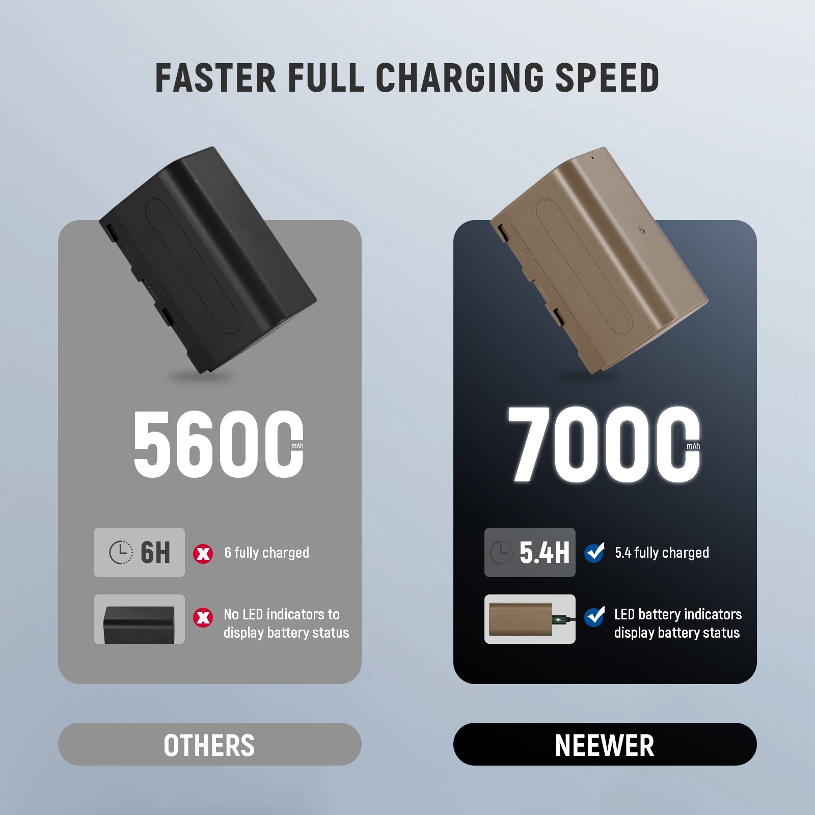 - Compatible with Various Equipment- A replacement for all NP-F series batteries, including NP-F550, NP-F570, NP-F750, NP-F770, NP-F960, NP-F970, NP-F975. Compatible with Sony CCD-RV CCD-SC CCD-TR CCD-TRT CCD-TRV CVX DSR DCR GV HDR HVL HVR MPK MVC PBD PLM series cameras and camcorders, NEEWER LED panel lights, ring lights, and field monitors