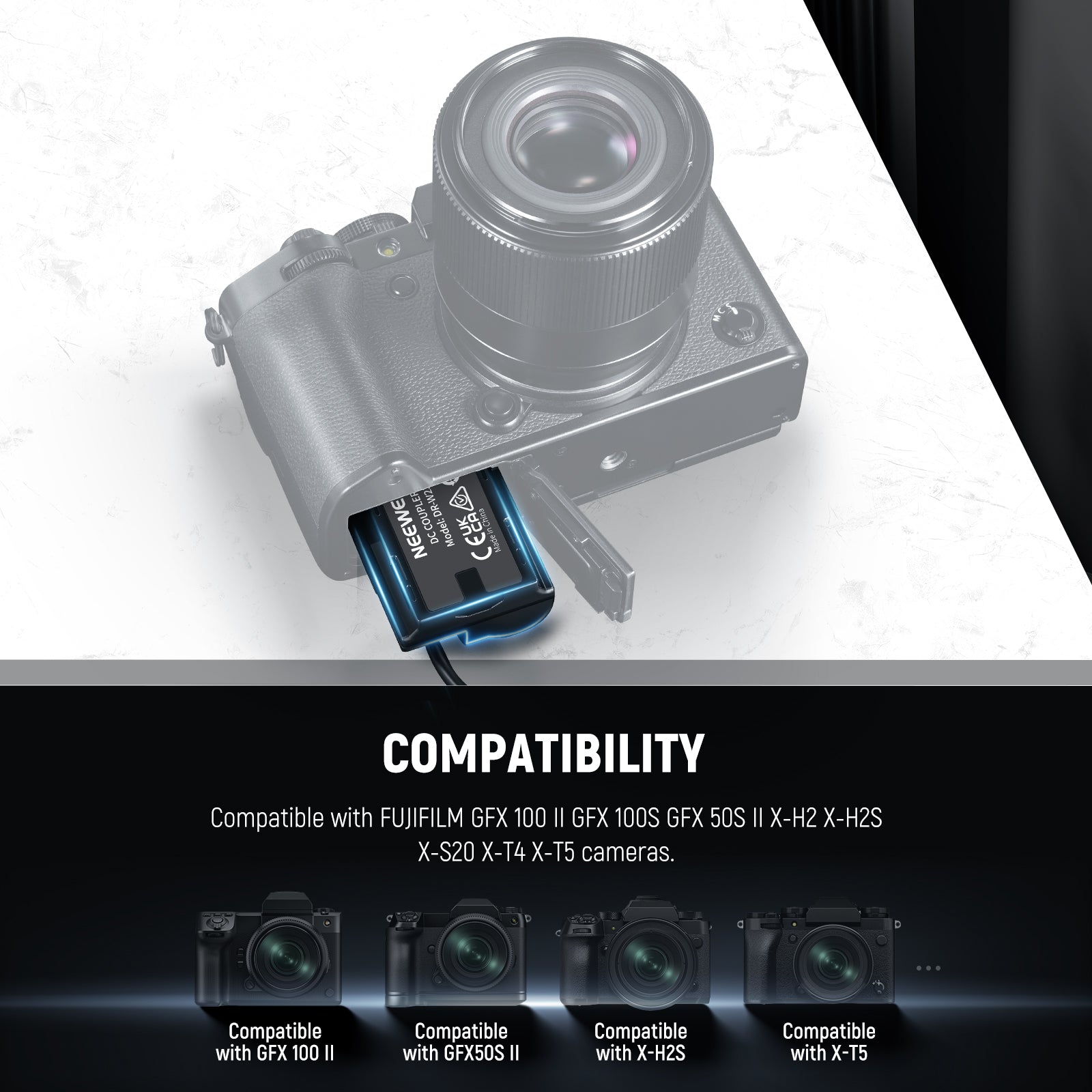 - Compatible Models- Compatible with Fujifilm cameras, this DR-W235 replacement dummy battery coupler kit fits seamlessly into various camera models, including GFX 100 II GFX 100S GFX 50S II X-H2 X-H2S X-S20 X-T4 X-T5 cameras. It's a reliable power solution for professional photographers, videographers, and enthusiasts alike