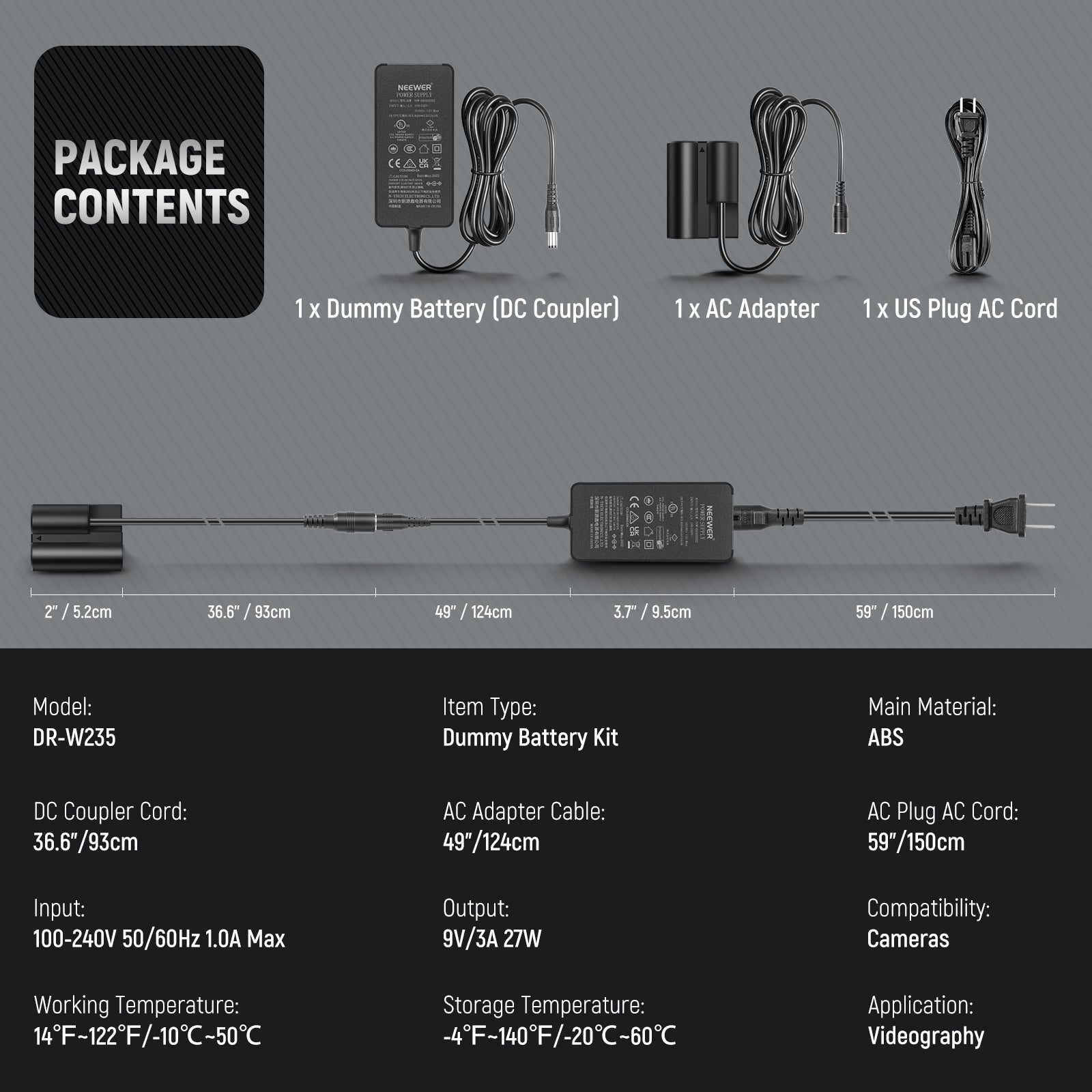 - 144.6"/367cm Super Length- With a 36.6"/93cm DC coupler, a 49"/124cm AC power adapter, and a 59"/150cm US plug AC cord, the dummy battery kit (combined length: 144.6"/367cm) offers ample cable length for flexible setup and positioning, adapting to various shooting environments effortlessly