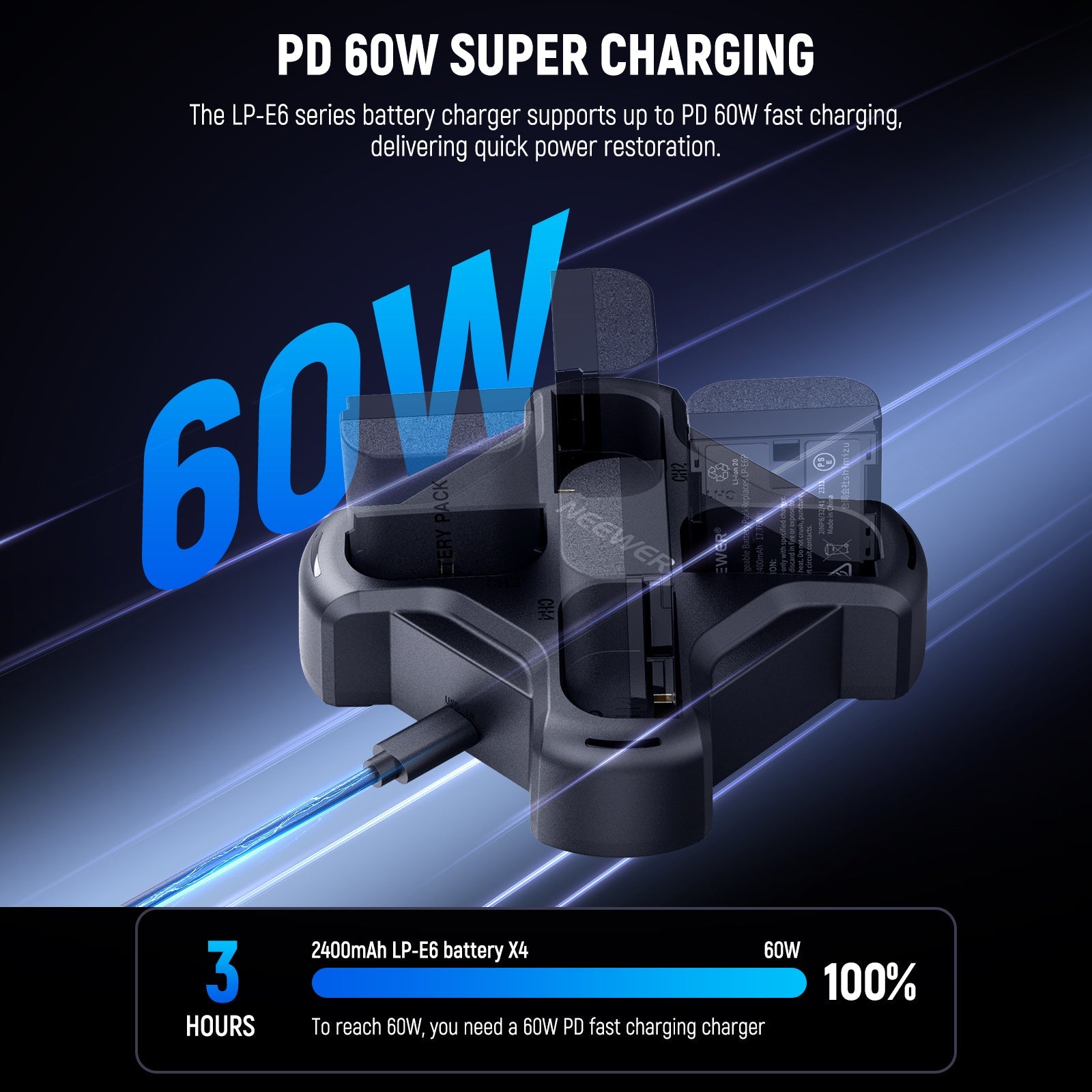 - For LP-E6 Series Batteries- NEEWER NW-P4 four channel battery charger is designed to simultaneously recharge four LP-E6, LP-E6N, LP-E6NH, or LP-E6P batteries, providing an efficient and reliable power backup for continuous shooting compatible with Canon EOS R5 Mark II 6D/6D Mark II 5D Mark III 5D Mark IV cameras, and more. Note: Recommended to use with NEEWER PD200W0500G4T 100W GaN charger for optimal efficiency