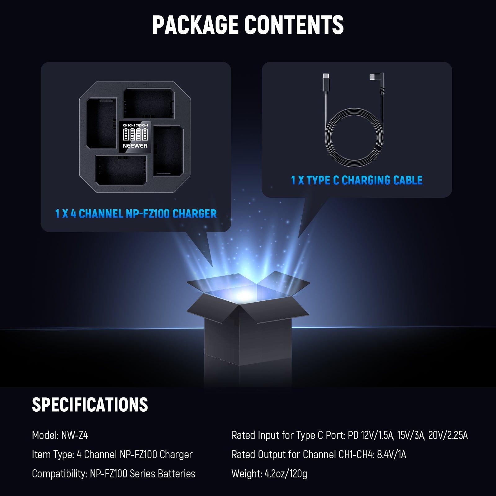- Portable NP-FZ100 Charger with Battery Display- The NW-Z4 charger is favored for its compact and lightweight design, weighing only 4.2oz/120g, easily slipping into your backpack or gear bag, providing a streamlined charging solution for outdoor shooting. Integrated with a battery display to show the real time charging status of each battery once plugged in