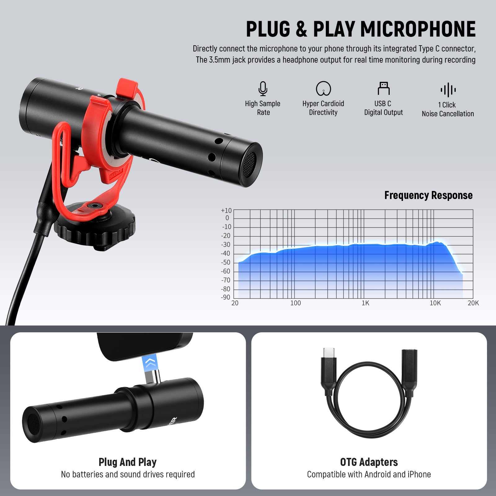 - Plug & Play USB C Microphone- The mini cardioid mic with noise cancellation ensures clear audio. Its USB C connector, paired with two included OTG adapters, is compatible with Samsung S24 Ultra, other Android smartphones as well as iPhone 16 Pro Max and early iPhone models. Plug and play, simply plug it in and start recording