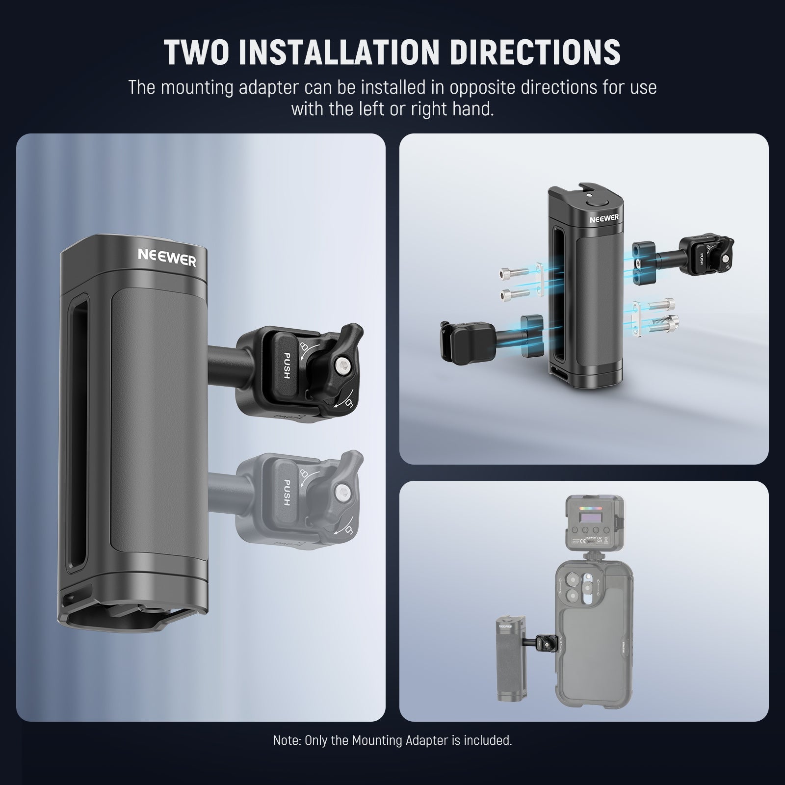 - Side Handle Compatibility- For select NEEWER side handle grip models, including CA022H, CA023H, CA067H, CA068H, CA069H, PA005E, and PA028E. Note: Remove the original connector from your side handle before installing this adapter