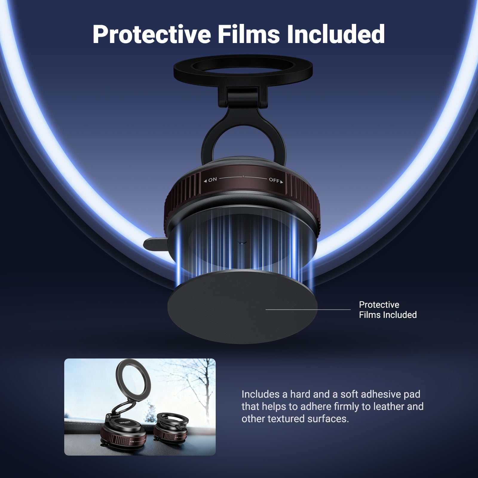 • Protective Films Included- The overhead mobile phone mount comes with a hard and a soft adhesive pad. Apply these before using the car suction cellphone holder stand for a stronger grip and to protect surfaces from damage