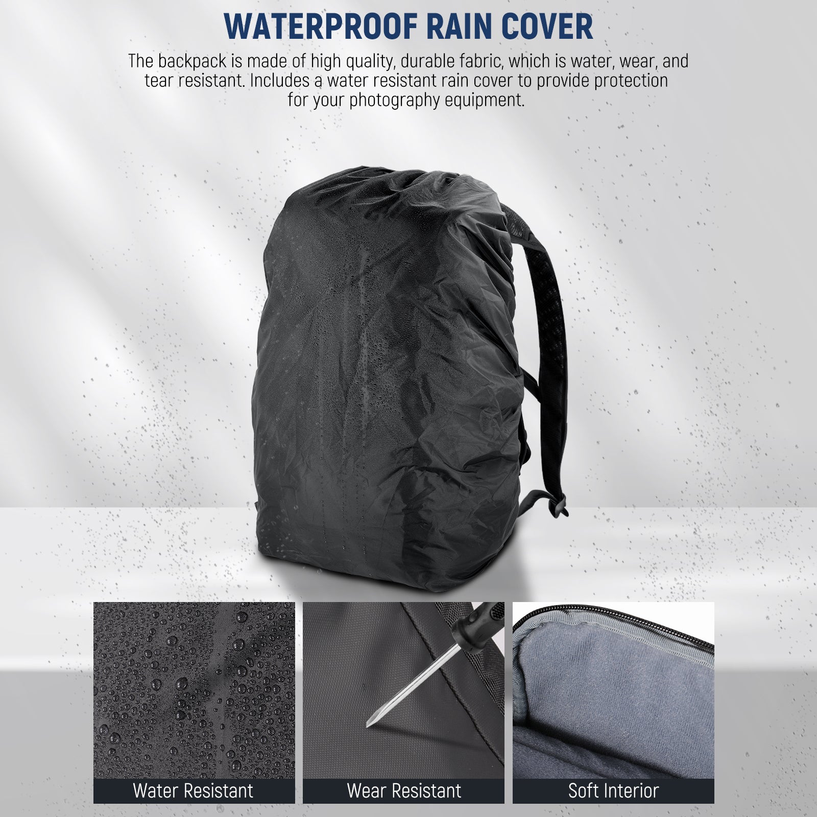 - Water Repellent with Rain Cover- Upgraded with durable, water repellent fabric, this compact, minimalist design measures 11.4" x 8.6" x 19.3" / 29.2 x 22 x 49.1cm and weighs 4.54lb/2.06kg. Perfect for photography on the go. Also includes a rain cover for the backpack to protect your valuable gear during inclement weather. The reflective stitching adds safety during nighttime travel