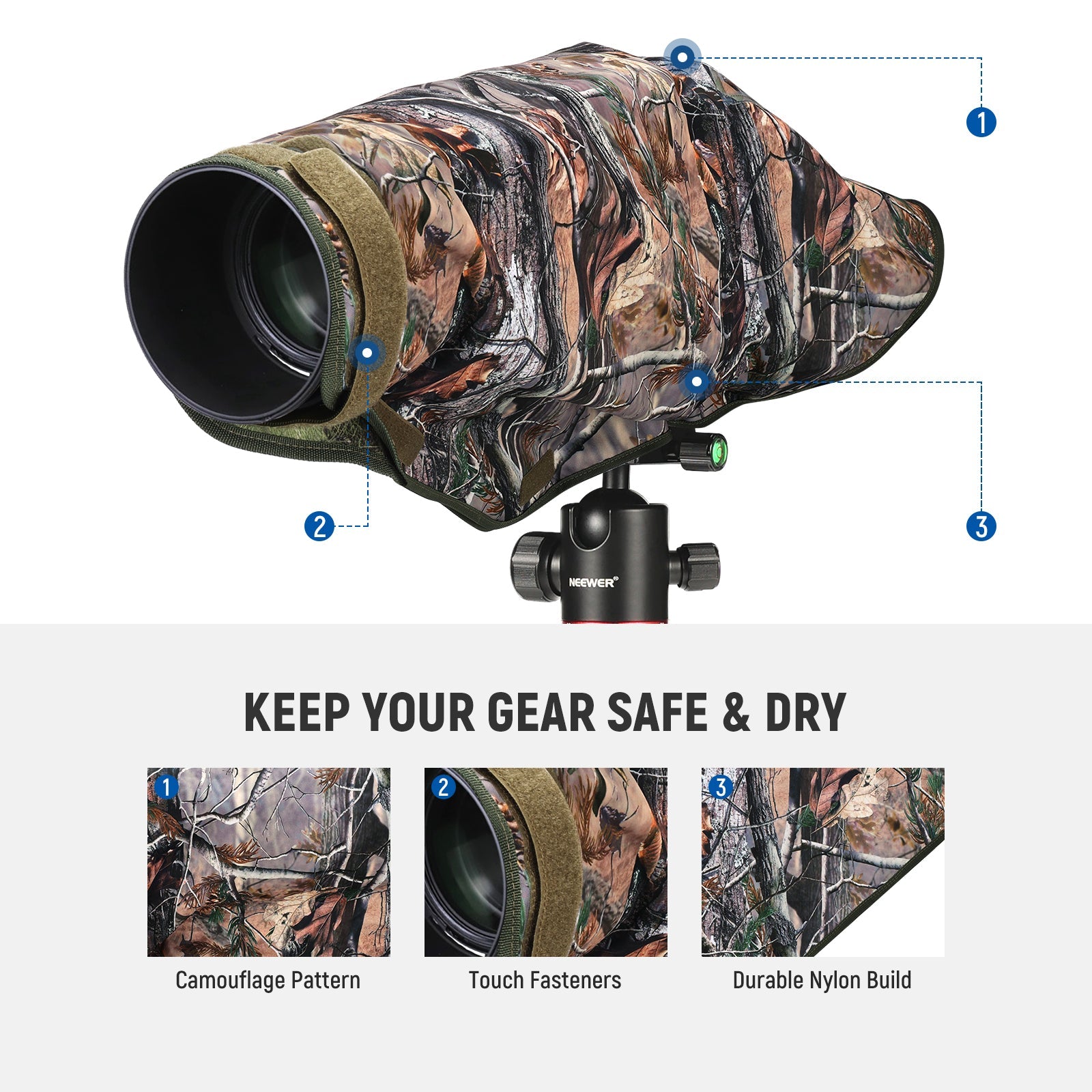 - Protective Camera Rain Cover- This rain cover shields your camera or telephoto lens from water, rain, moisture, dust, dirt, and other debris, prevents water damage, and maintains their optimal performance in wet conditions or other adverse outdoor environments