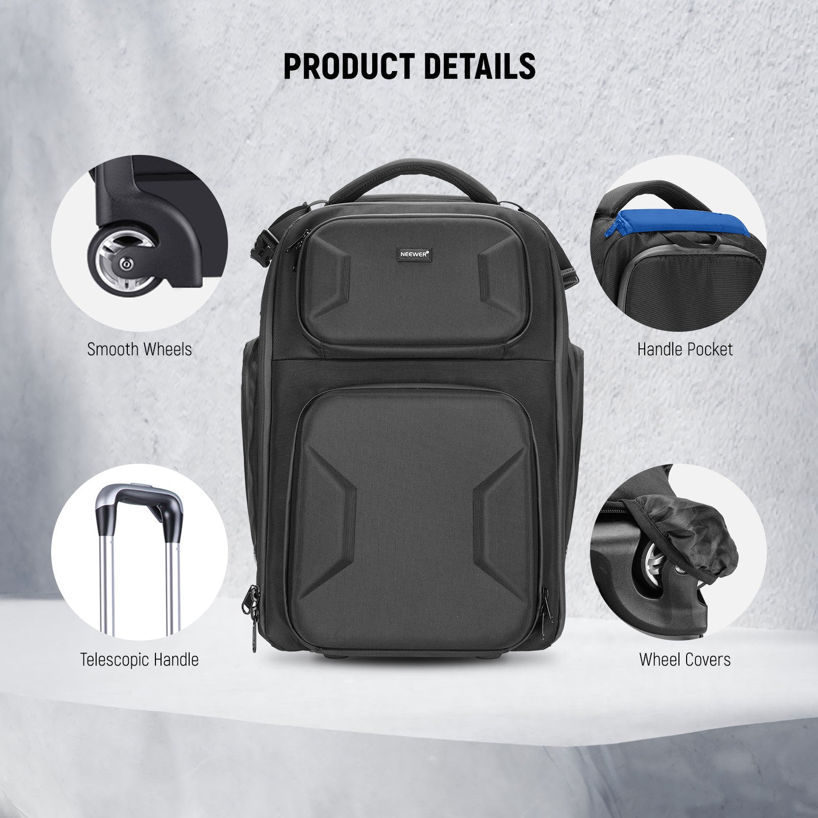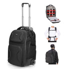 - 2 In 1 Carry On Camera Roller Bag- This 2 in 1 camera roller bag can transform from a smooth trolley case into a comfortable backpack for outdoor content creation. It allows you to board with your valuable equipment and safely store it in the overhead bin (carry on size requirements may vary by airlines). Exterior size: 19.7" x 12.6" x 11.4"/50 x 32 x 29cm (46.4L); interior size: 17.7" x 13.4" x 6.7"/45 x 34 x 17cm (26L)