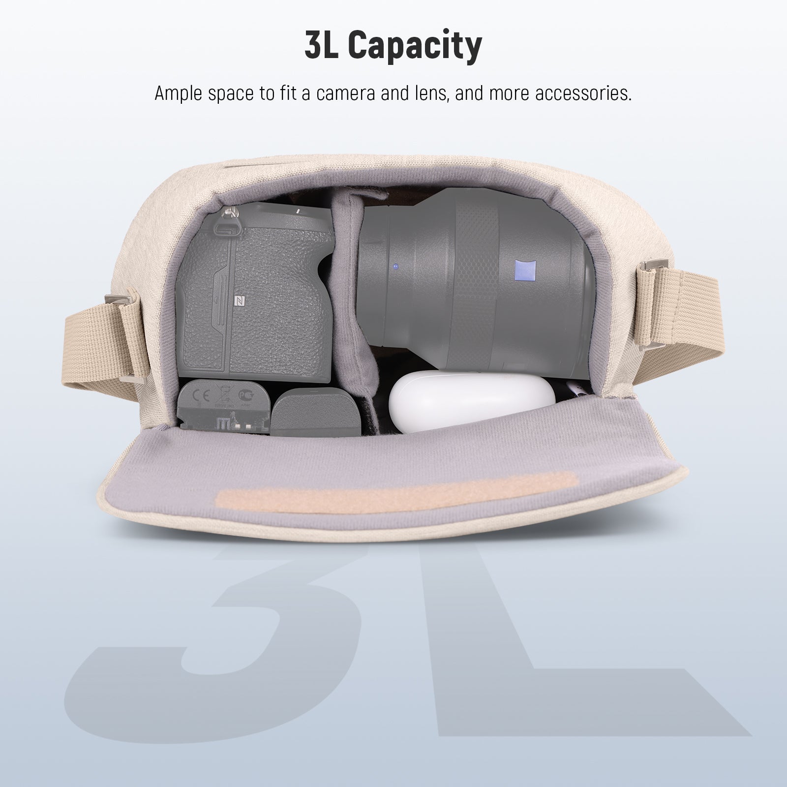 - 3L Capacity & Removable Divider- The camera shoulder bag is equipped with a removable divider, which allows you to customize the space to conveniently store your camera and lens. Equipped with small pockets, the digital camera case allows you to neatly organize smaller items such as filters, a small lens case and batteries. The closure is equipped with hooks and loops for easy access.