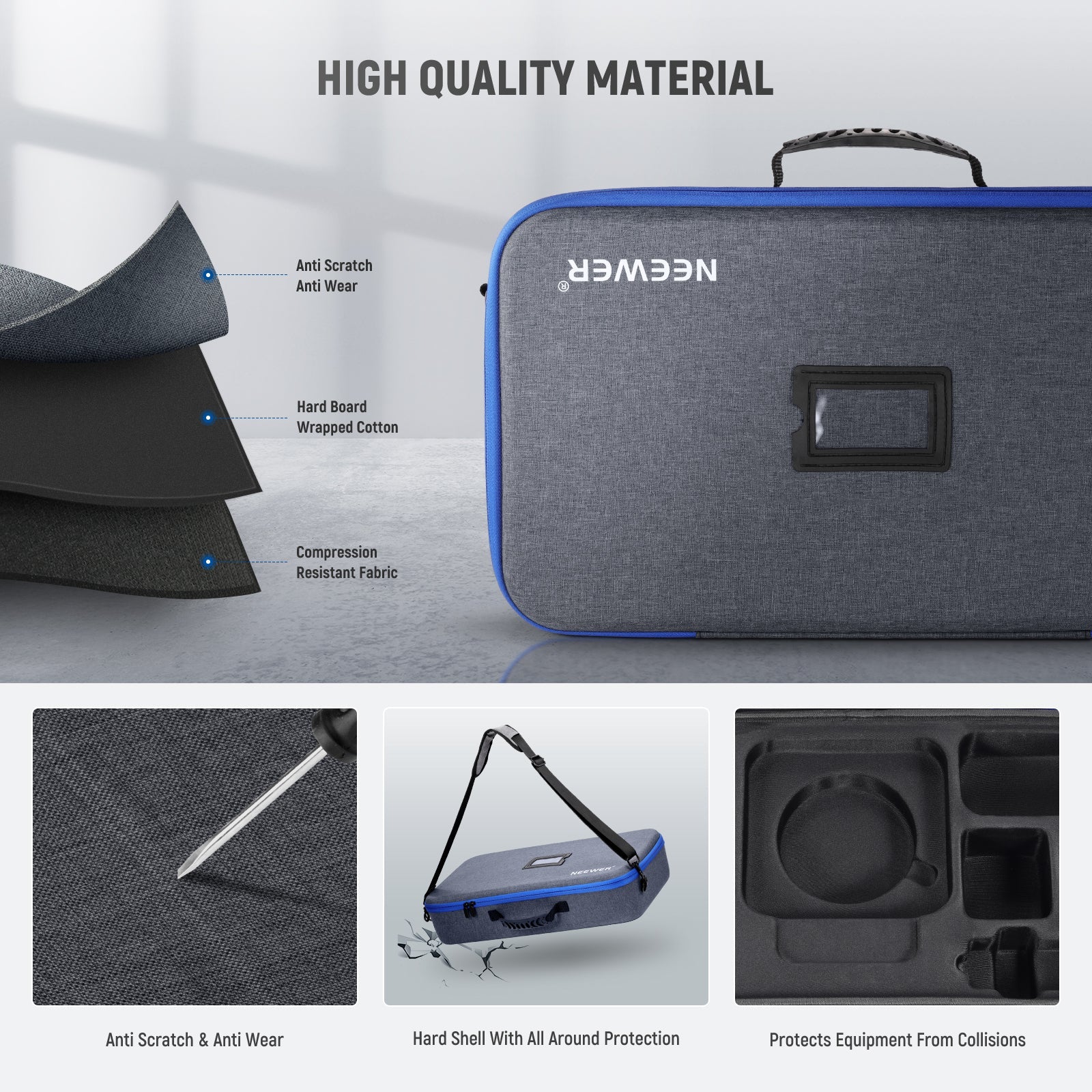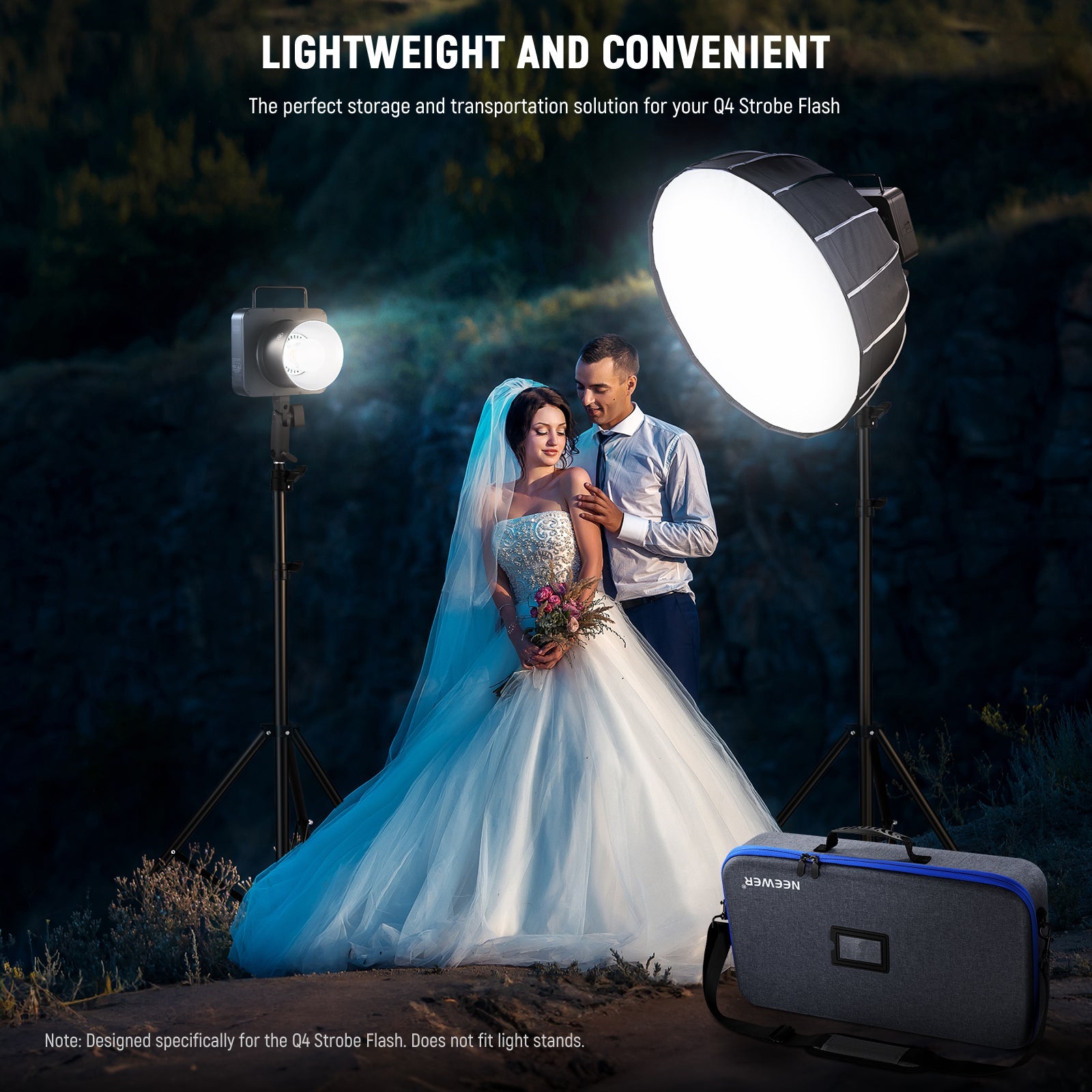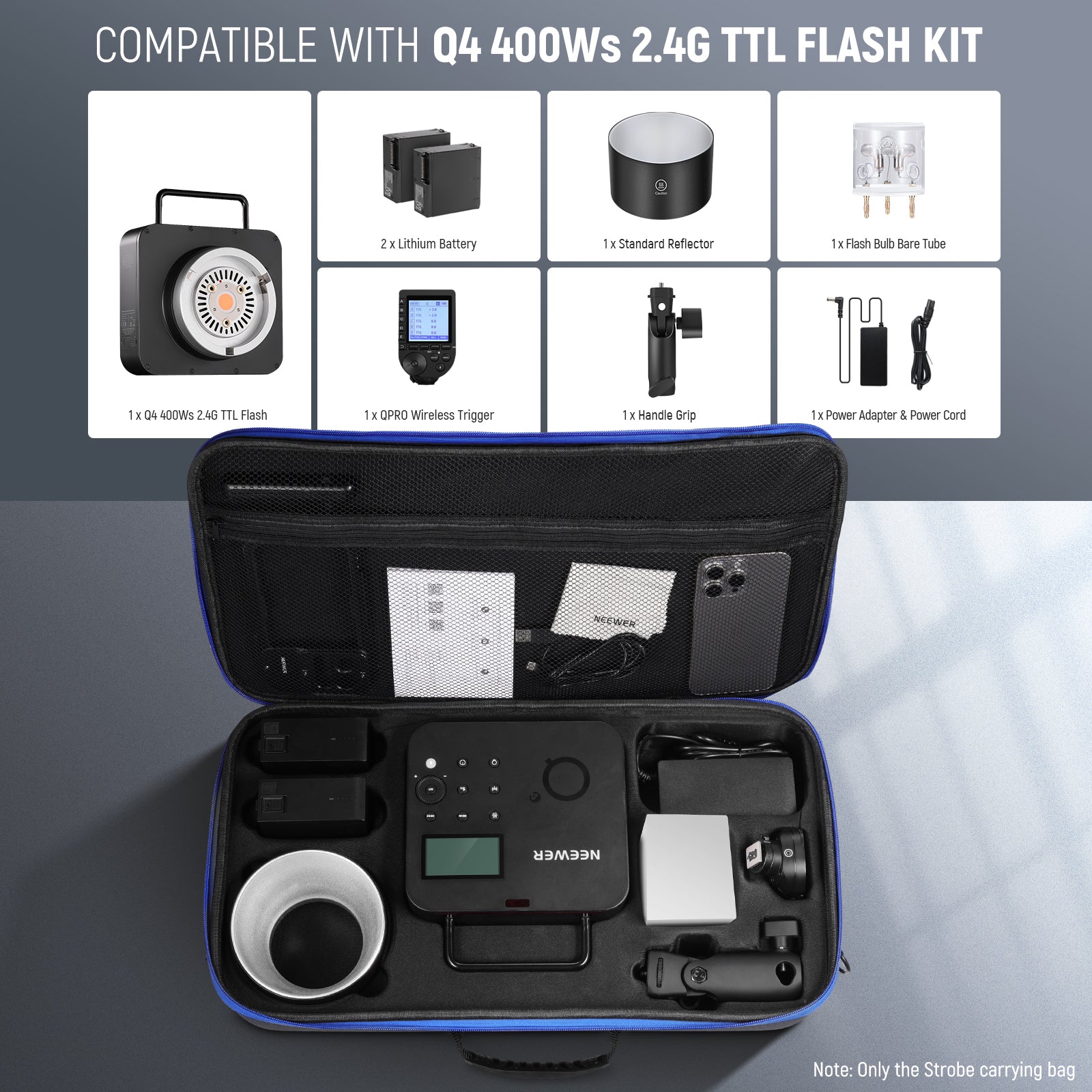 • Portable Storage Travel Bag for Q4- This bag is custom designed and fully compatible with NEEWER Q4 Outdoor flash strobe speedlight and the related accessories, this 20.5" x 11" x 4.3"/52 x 28 x 11cm carrying bag provides dedicated grooves for organizing the Q4 flashlight , tilt handle, standard bowens reflector, batteries, wireless trigger, power cord, flash bulb.